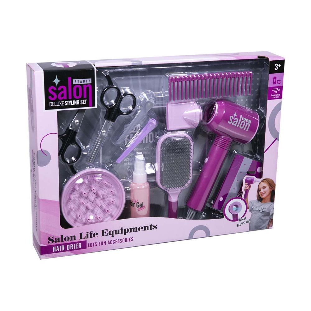 Παιδικό σετ κομμωτηρίου το οποίο θα εντυπωσιάσει και θα λατρέψει κάθε μικρό κορίτσι. Περιλαμβάνει σεσουάρ μαλλιών όπου βγάζει αέρα με 2 ταχύτητες, χτένα, βούρτσα, τσιμπιδάκια μαλλιών, δύο ψαλίδια, λαδάκι μαλλιών και διάφορα άλλα αξεσουάρ. Τώρα το μαλλί σου θα είναι πιο περιποιημένο από ποτέ! Παιχνίδι ομορφιάς που προσφέρει ώρες δημιουργικού παιχνιδιού, όπου μέσα από τη μίμιση διεγείρει την φαντασία, ενθαρρύνει τη συνεργασία και τονώνει την αυτοπεποίθηση του παιδιού.