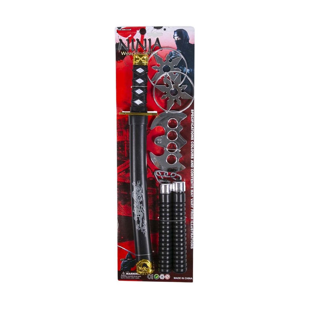 Το σετ περιλαμβάνει σπαθί Ninja με θήκη 42.5cm, νουτσάκου, 2 αστέρια και σιδερογροθιά. Μήκος όπλου: 42.2cm.