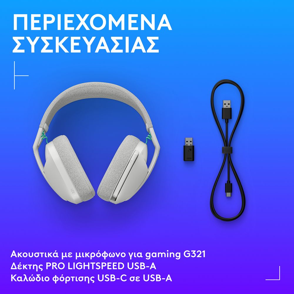 Περιεχόμενα συσκευασίας: Ασύρματα ακουστικά με μικρόφωνο για gaming G321 LIGHTSPEED, Ασύρματος δέκτης USB-A LIGHTSPEED, Καλώδιο φόρτισης USB-C σε USB-A, Εγχειρίδιο χρήστη.