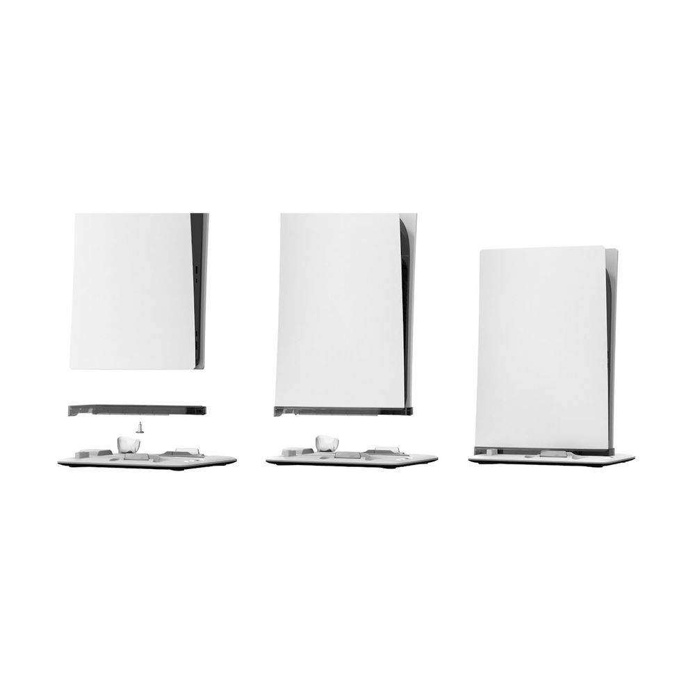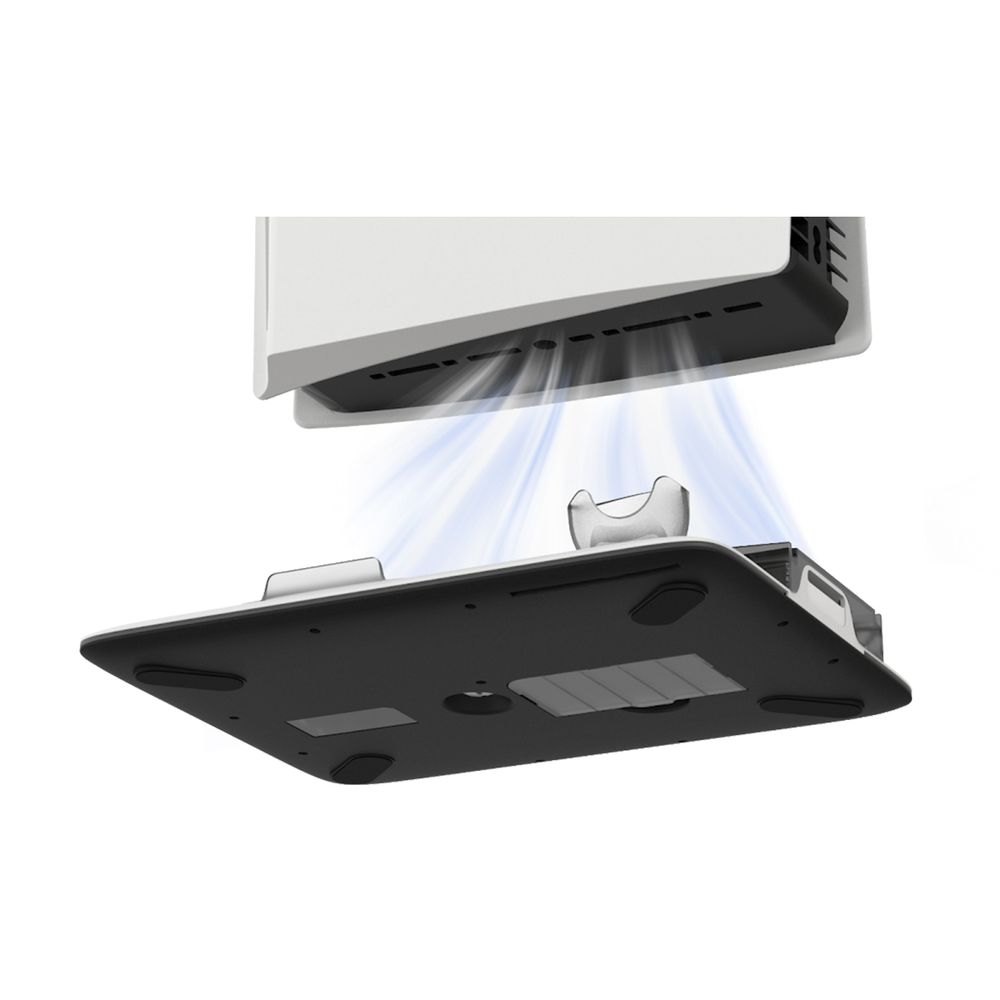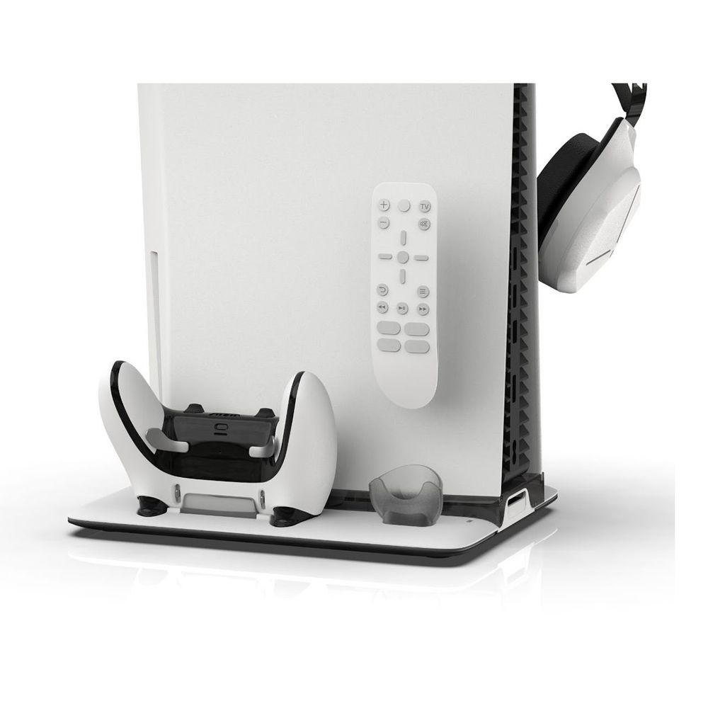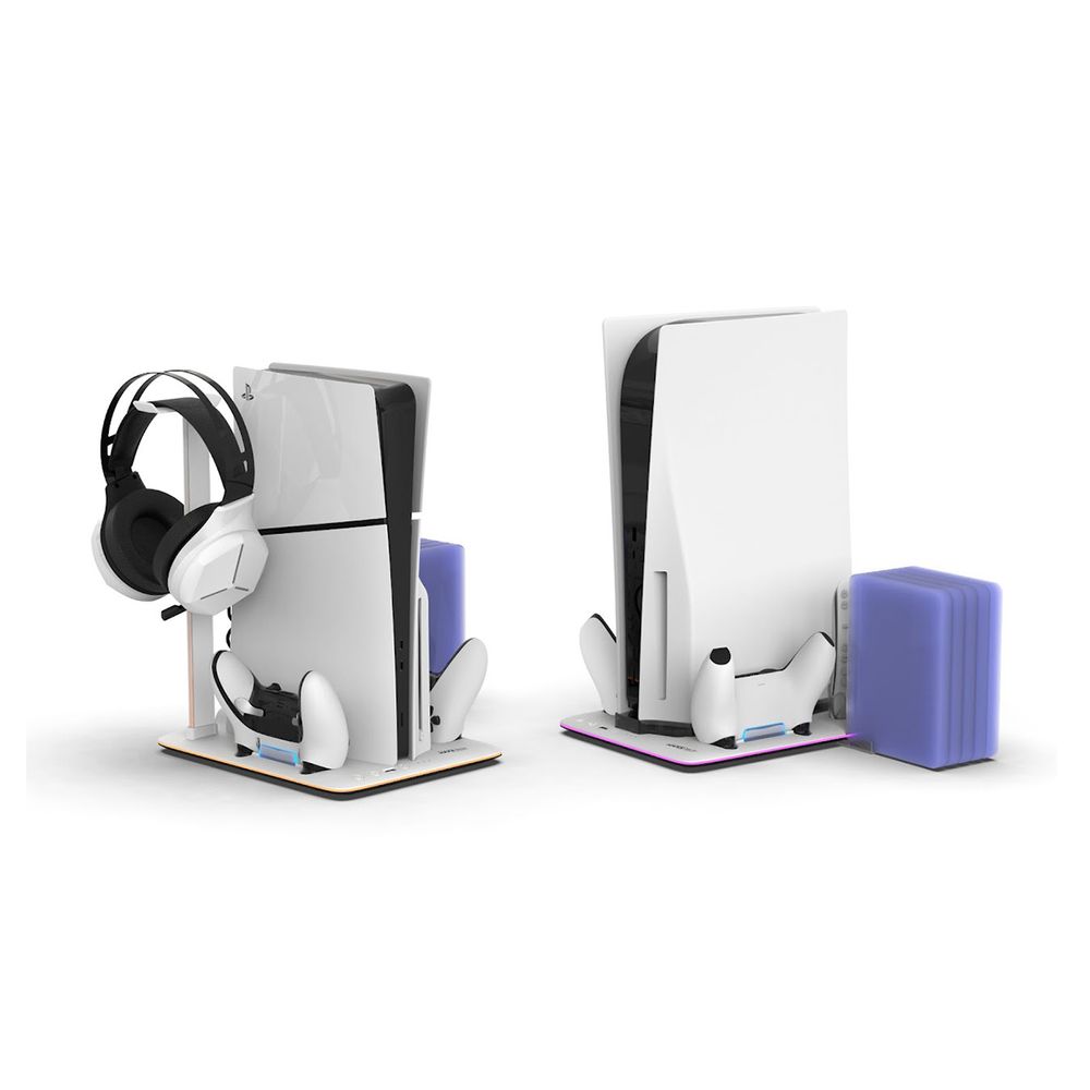 Ο κομψός και διακριτικός σχεδιασμός της βάσης φόρτισης πολλαπλών λειτουργιών PS5 συμπληρώνει ιδανικά την κονσόλα PS5® και PS5 Slim. Διαθέτει πλατφόρμα drop & charge για τα χειριστήρια DualSense και DualSense Edge, με φωτισμό LED. Ο ανεμιστήρας 3 ταχυτήτων βοηθά στην απομάκρυνση της θερμότητας, ενώ προσφέρει χώρο για Gaming Headset, τηλεχειριστήριο και παιχνίδια. Περιλαμβάνει αντάπτορες USB-C, καλώδιο USB-A & USB-C και αναδιπλούμενο ράφι για 5 παιχνίδια. Συμβατό με PS5 και PS5 Slim.