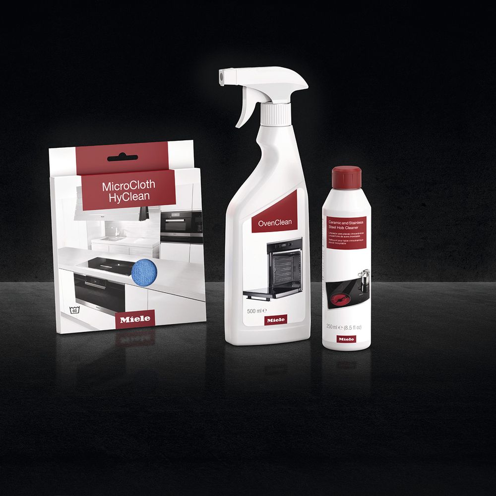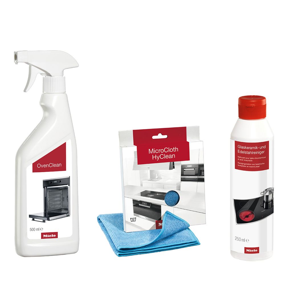 Το σετ καθαρισμού της Miele διαθέτει πολυχρηστικό πανί μικροϊνών, καθαριστικό φούρνου 500 ml και καθαριστικό κεραμικών και ανοξείδωτων επιφανειών 250 ml.