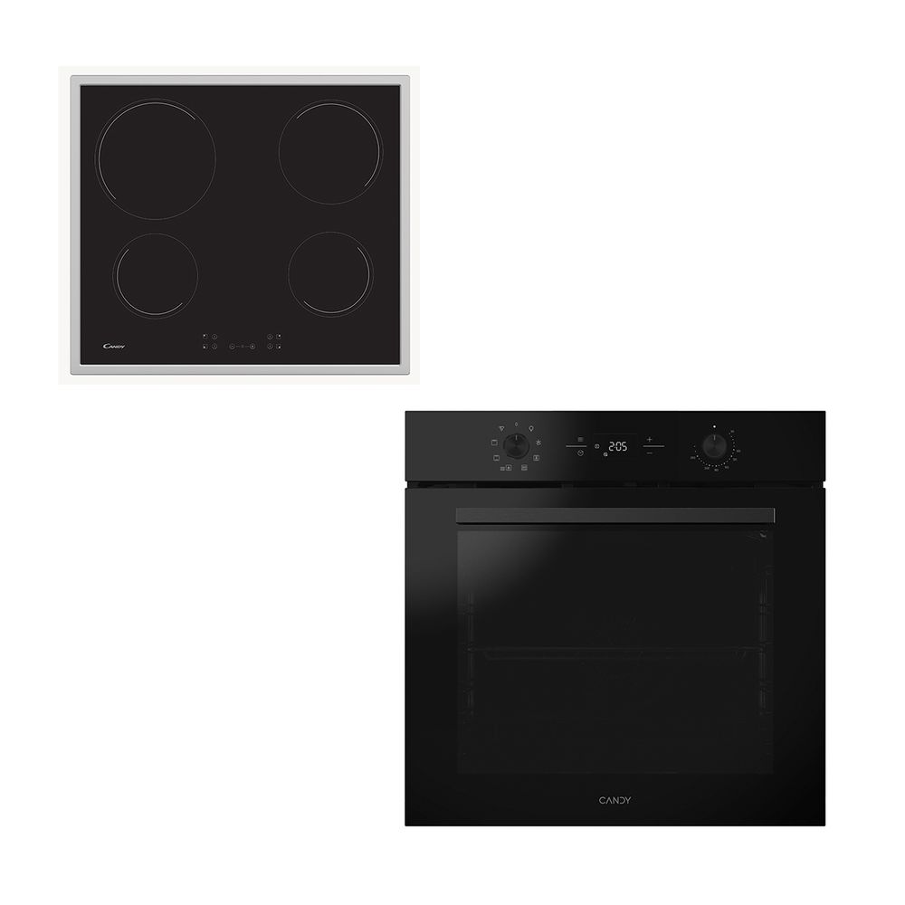 Σετ εντοιχισμού το οποίο αποτελείται από τον εντοιχιζόμενο φούρνο Candy CA6 NP3T2HTB Black και τις κεραμικές εστίες Candy CH64FC.