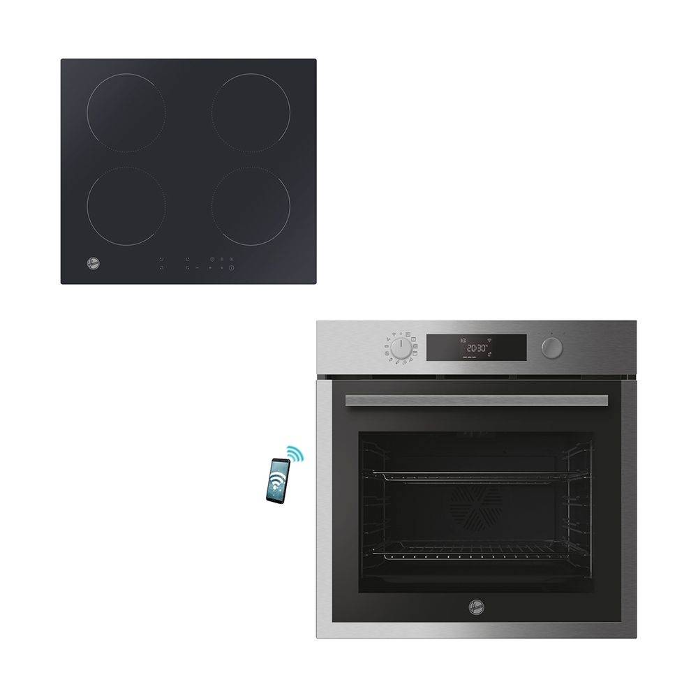 Σετ εντοιχισμού το οποίο αποτελείται από τον εντοιχιζόμενο φούρνο Hoover UP5B3YTX Inox και τις επαγωγικές εστίες Hoover HI642CTT/1.