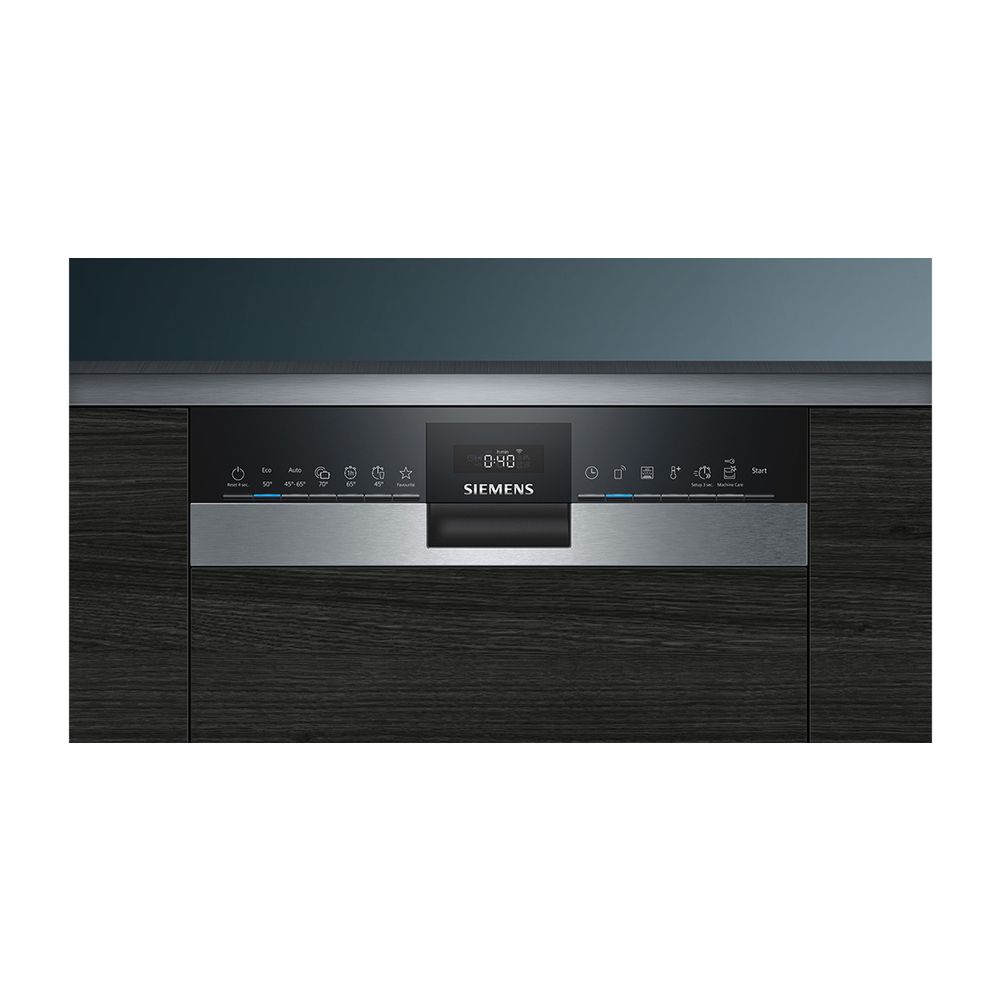 Εντοιχιζόμενο πλυντήριο πιάτων SR53ES28KE από τη Siemens, της σειράς iQ300, με εμφανή μετόπη, πλάτος 45 cm, από ανοξείδωτο ατσάλι με χωρητικότητα 9 σερβίτσια και επίπεδο θορύβου τα 44 dB. Έχει 6 προγράμματα: Α) Οικονομικό 50 °C, Β) Αυτόματο 45-65 °C, Γ) Εντατικό 70 °C, Δ) 1 ώρα 65 °C, Ε) Γρήγορο 45 °C, ΣΤ) Πρόπλυση.