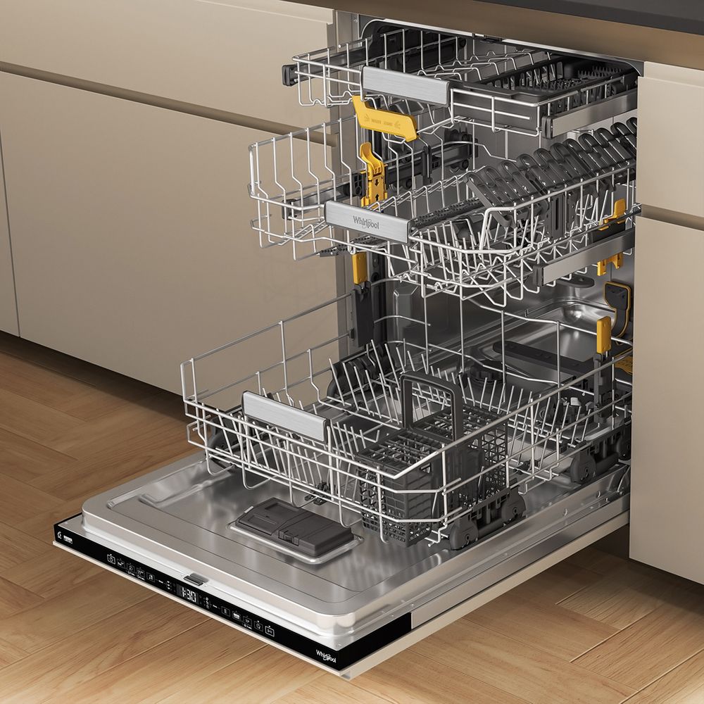 Εντοιχιζόμενο πλυντήριο πιάτων Whirlpool W8I HT40 T χωρητικότητας 14 σερβίτσιων, με τεχνολογία 6ης αίσθησης για αυτόματη ρύθμιση θερμοκρασίας και χρόνου ανάλογα με το επίπεδο βρωμιάς.