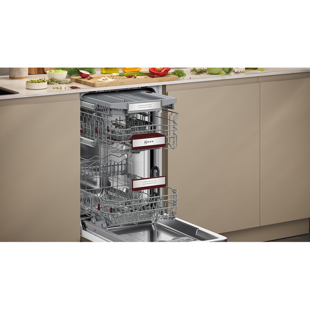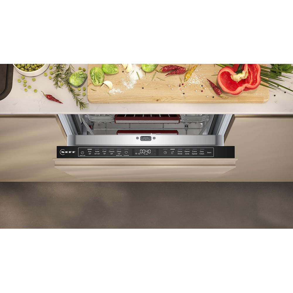 Εντοιχιζόμενο πλυντήριο πιάτων S897ZM801E της εταιρείας Neff με χωρητικότητα 10 σερβίτσια, 6 προγράμματα, κινητήρα Eco silence drive, οθόνη ενδείξεων στο άνω μέρος του πλυντηρίου καθώς και Home Connect για απομακρυσμένη πρόσβαση και χειρισμό.