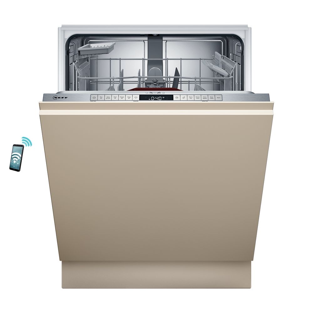 Εντοιχιζόμενο πλυντήριο πιάτων S155EAX04E Neff με χωρητικότητα 13 σερβίτσια, 6 προγράμματα, κινητήρα Eco silence drive, οθόνη ενδείξεων στο άνω μέρος του πλυντηρίου καθώς και Home Connect για απομακρυσμένη πρόσβαση και χειρισμό.