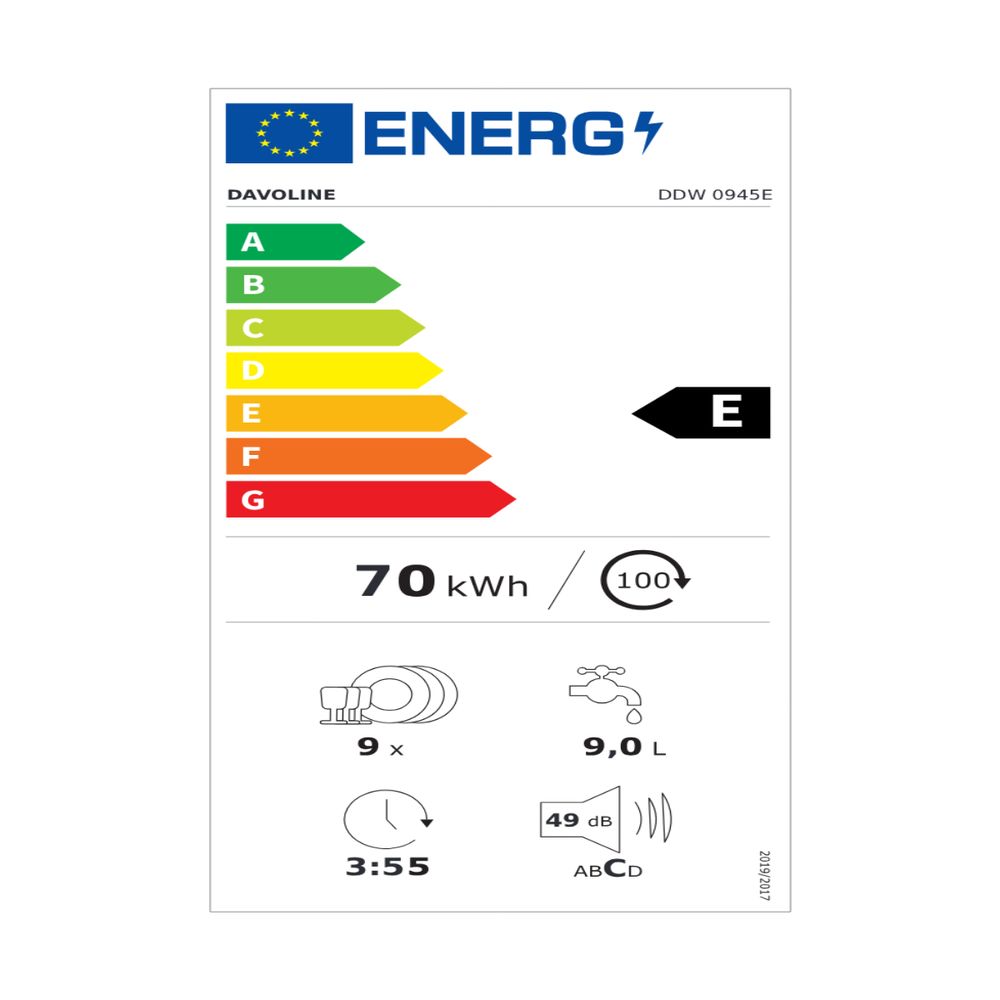 Επίλεξε το Davoline DDW 0945E και απόλαυσε λειτουργικότητα και οικονομία. Με ενεργειακή κλάση E, κατανάλωση ρεύματος 70 kWh και μόλις 9 λίτρα νερού ανά κύκλο, εξοικονομείς ενέργεια και χρήματα. Διαθέτει 5 προγράμματα πλύσης, λειτουργία μισού φορτίου, καθυστέρηση έναρξης και χωρητικότητα 9 σερβίτσιων για άνεση και ευελιξία.
