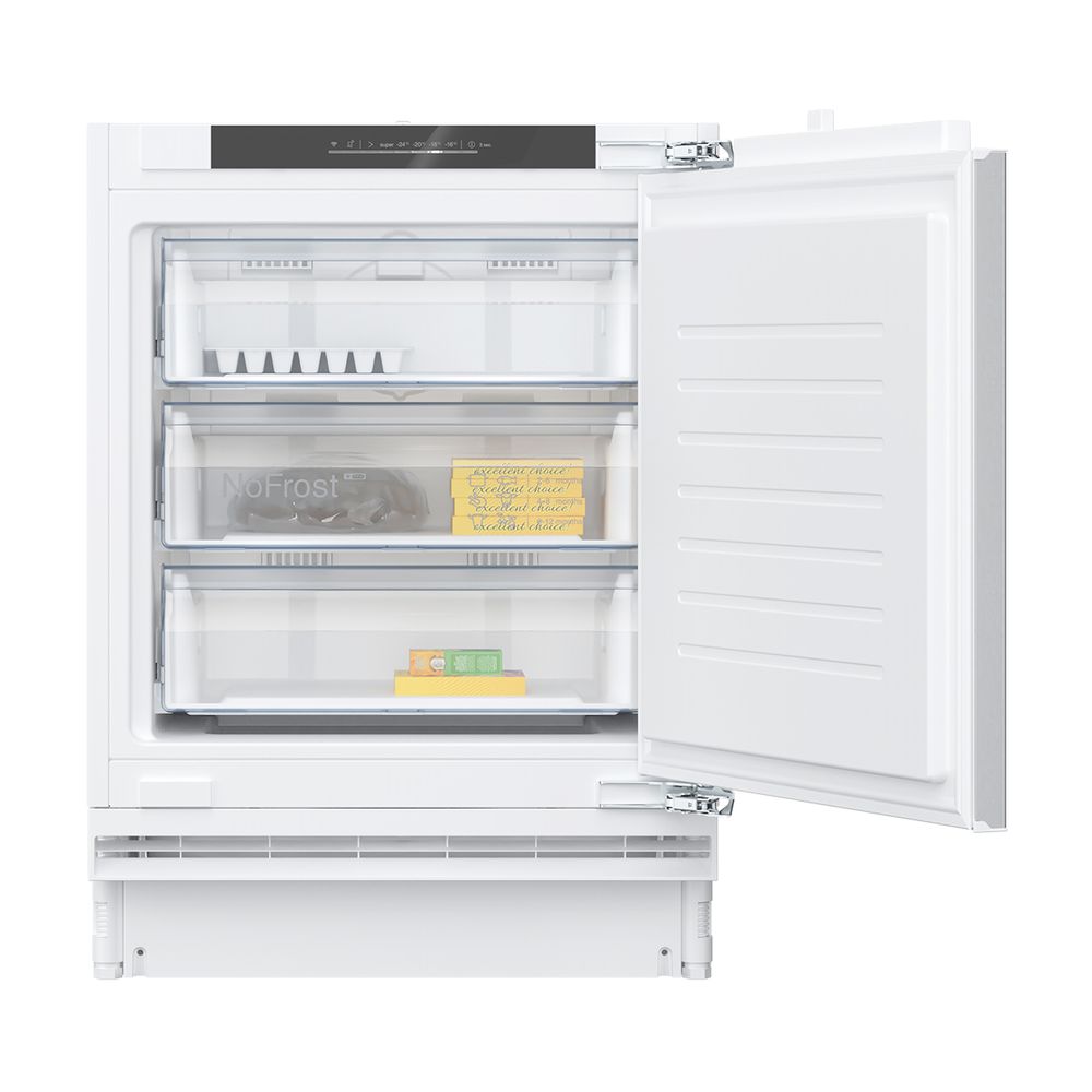 Εντοιχιζόμενος καταψύκτης GU7213DE0 της εταιρείας Neff με μικτή χωρητικότητα 83 λίτρα, ύψος 82 εκατοστών, τεχνολογία NoFrost, οθόνη ενδείξεων, διατήρηση σταθερής θερμοκρασίας σε περίπτωση διακοπής ρεύματος καθώς και ειδοποίηση για υψηλές θερμοκρασίες. Τέλος, διαθέτει και Soft Close για απαλό κλείσιμο πόρτας του καταψύκτη.