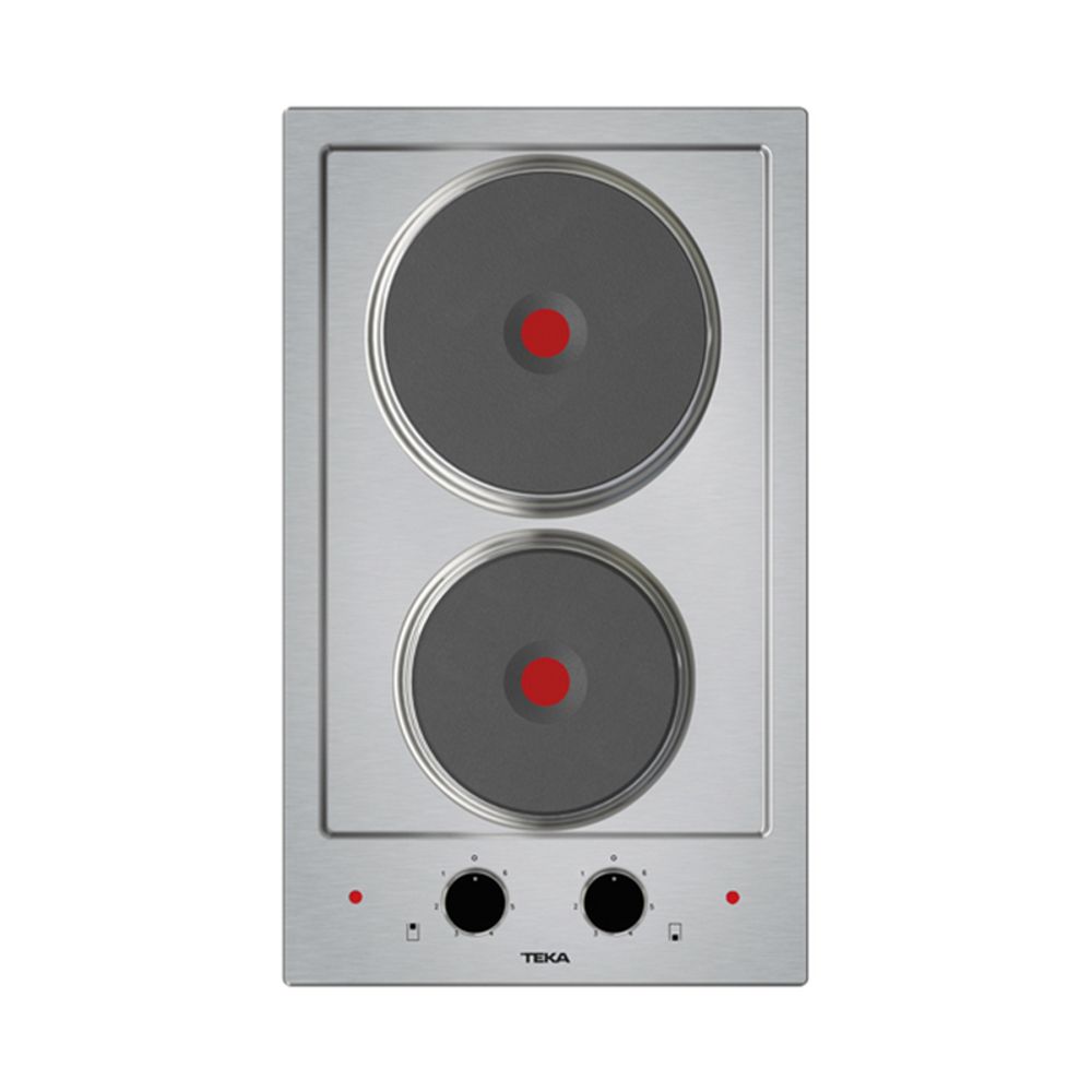 Ανοξείδωτο πλατώ εστιών domino με 2 ηλεκτρικές ζώνες και περιστρεφόμενους διακόπτες, πλάτους 30.5cm με περιστρεφόμενους διακόπτες και ένδειξη λειτουργίας εστιών.