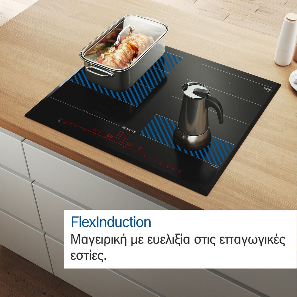 Η επαγωγική εστία FlexInduction σου επιτρέπει να τοποθετείς πολλές κατσαρόλες και τηγάνια ή και μεγαλύτερα μαγειρικά σκεύη οπουδήποτε επιθυμείς στην ευέλικτη ζώνη μαγειρέματος.