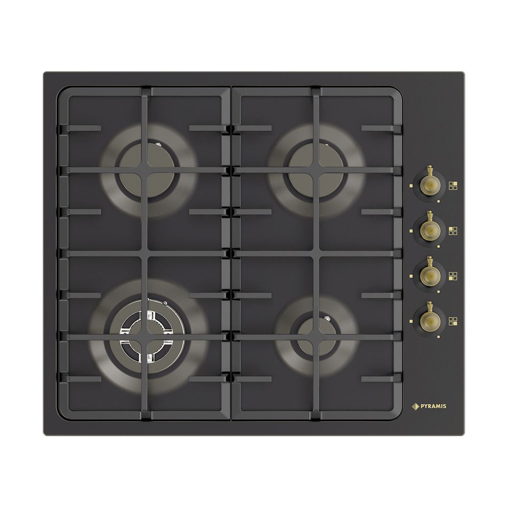 Εντοιχιζόμενη εστία κουζίνας 733071 της εταιρείας Pyramis σε μαύρο χρώμα με 4 ζώνες μαγειρέματος. Διαθέτει πλαϊνά περιστρεφόμενα κομβία ρουστίκ για την επιλογή των επιθυμητών θερμοκρασιών και ρυθμίσεων. Επιπλέον διαθέτει σχάρες από μαντέμι καθώς και βαλβίδα ασφαλείας.