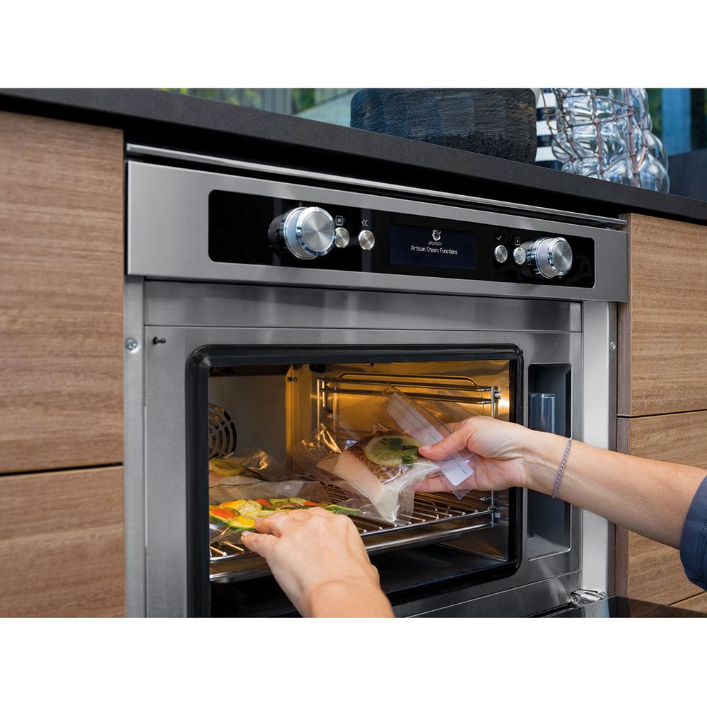 Εντοιχιζόμενος φούρνος KitchenAid KOQCX 45600 Combi Steam με 9 λειτουργίες (reheat, cook, steam defrost, manual, steam, forced air+ steam, forced air, assisted mode, sous-vide) και 7 ειδικές λειτουργίες (dough proving, steam cleaning, descale, drain, disinfection, yoghurt, preservation) για εύκολο μαγείρεμα χαρίζοντάς σου τέλεια αποτελέσματα.