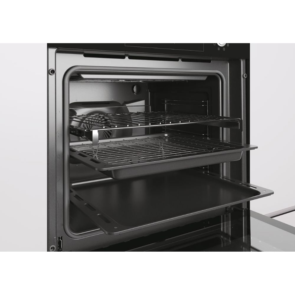 Ο φούρνος διαθέτει οδηγούς τοποθετημένους στα τοιχώματα (Wall-embedded). Η πόρτα είναι κατασκευασμένη από ανοξείδωτο ατσάλι και κρύσταλλο ασφαλείας.