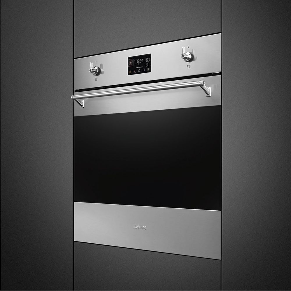 Εντοιχιζόμενος φούρνος SO6302ΤΧ σε Inox χρώμα από την εταιρεία Smeg, με χωρητικότητα 68 λίτρων, 10 λειτουργιών μαγειρέματος και VapoClean που είναι μια απλή λειτουργία καθαρισμού με ατμό για τη χαλάρωση των εναποθέσεων στην κοιλότητα του φούρνου. Επίσης είναι εξοπλισμένος με οθόνη LCD, προσφέροντάς σου μέγιστη άνεση.