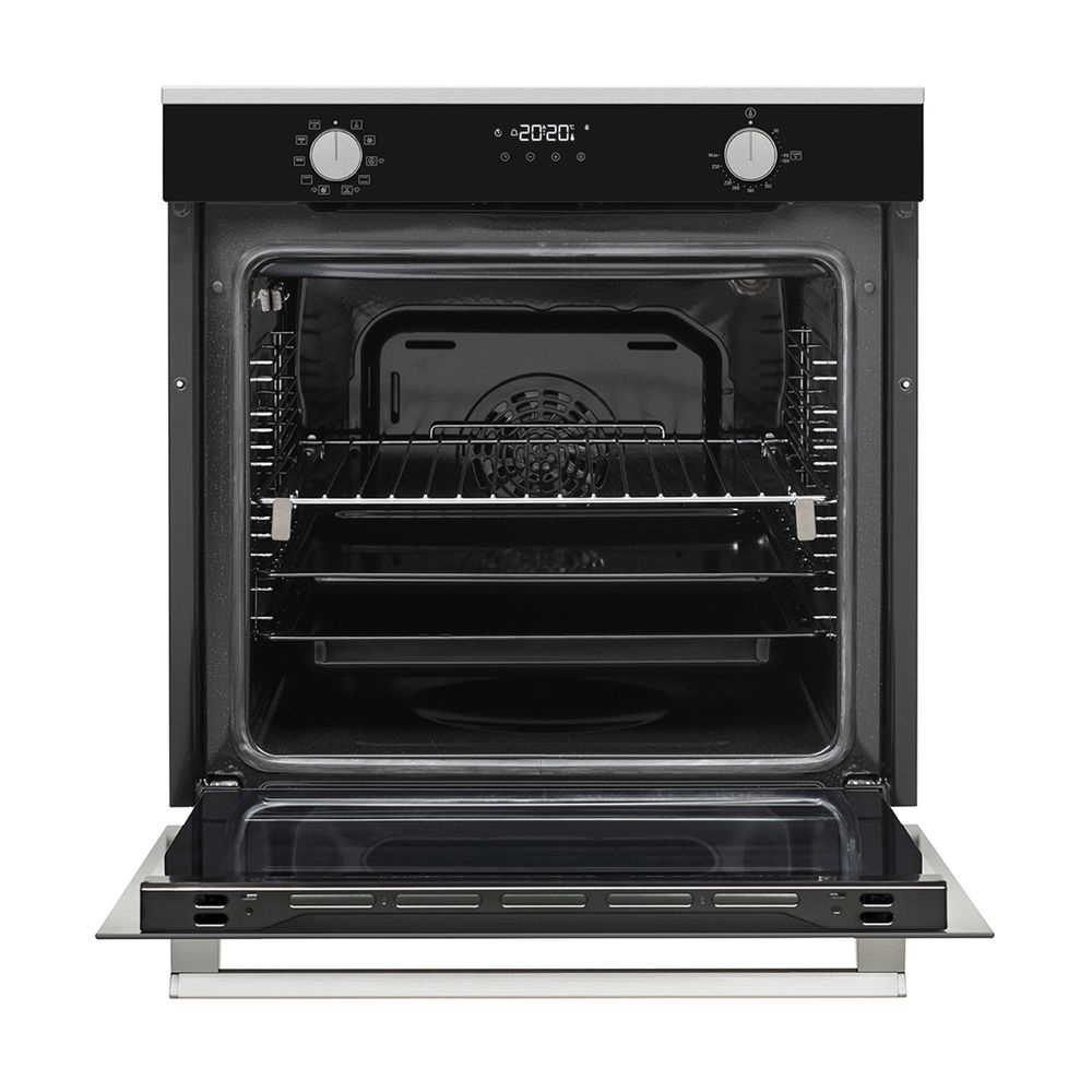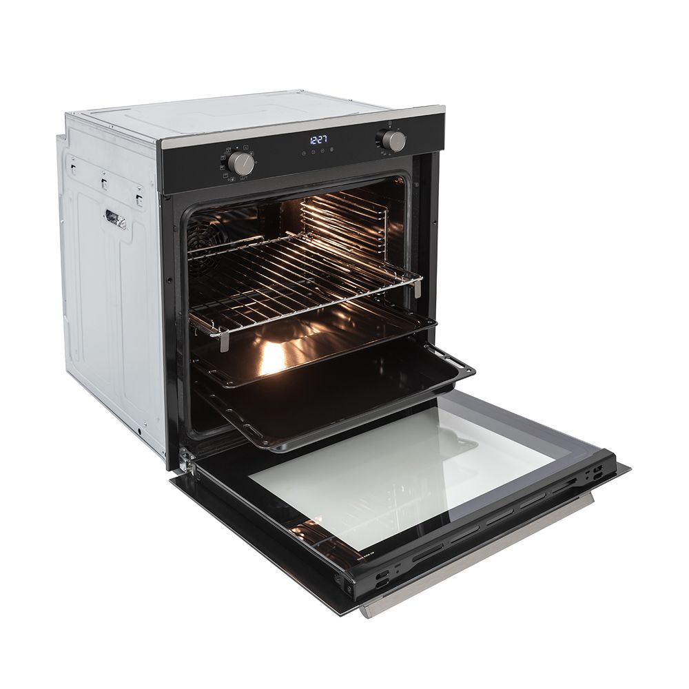 Φούρνος Multifunction Plus με λειτουργία καθαρισμού με υδρόλυση, 8 προγράμματα λειτουργίας, μαγείρεμα με τη χρήση ατμού, πρόγραμμα μαγειρέματος Pizza, τηλεσκοπικός μηχανισμός και 2 σταθεροί περιστροφικοί διακόπτες.