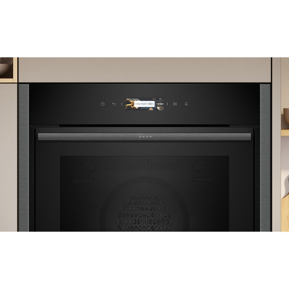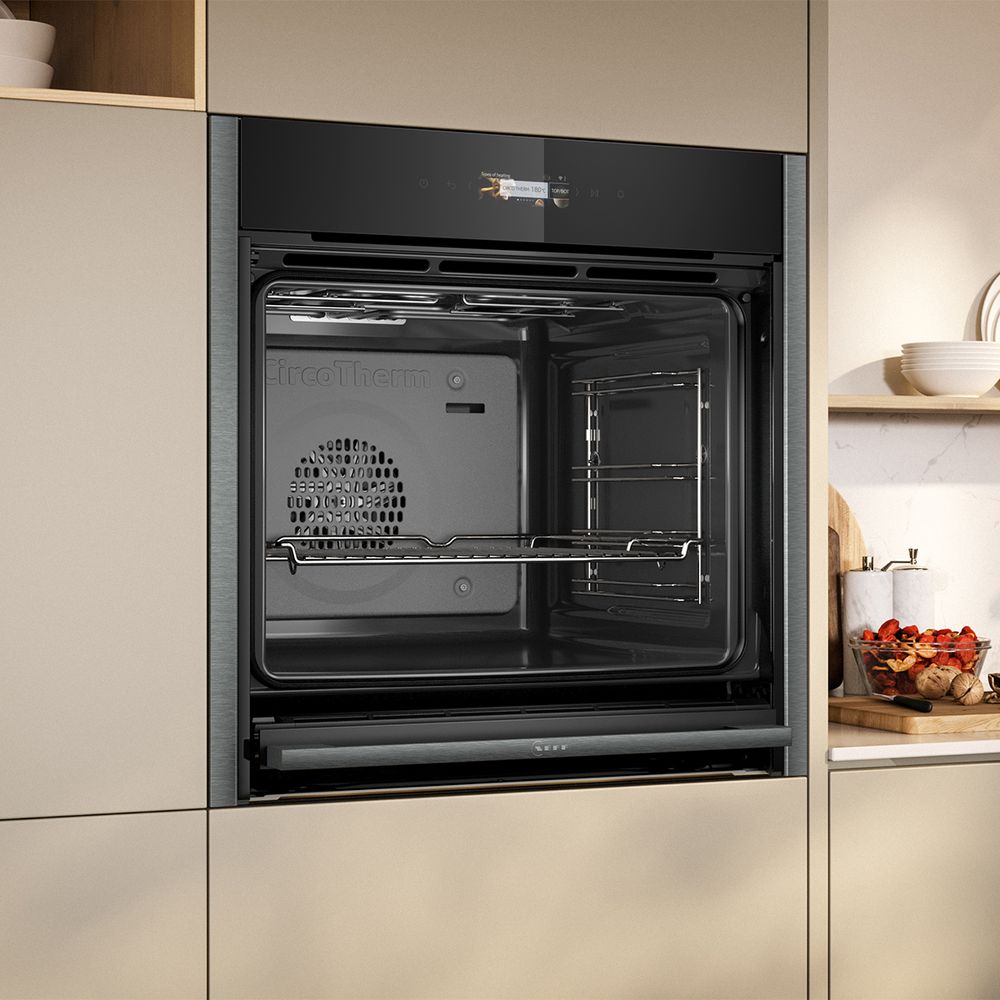 Εντοιχιζόμενος φούρνος Neff με 3,7" TFT οθόνη αφής, Circo Therm - το σύστημα θερμού αέρα της NEFF για μαγείρεμα σε παραπάνω απο ένα επίπεδο, και Home Connect για να ελέγχεις τον έλεγχος του φούρνο σου απομακρυσμένα μέσω της εφαρμογής. Ακόμα διαθέτει Slide & Hide - μια εύκολη στο χειρισμό πόρτα που εξαφανίζεται απαλά κάτω από το φούρνο.