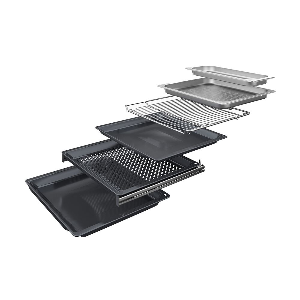 1 x εμαγιέ ρηχό ταψί, 1 x σχάρα, 1 x ταψί γενικής χρήσης, 1 x Air Fry ταψί, 1 x Δοχείο ατμού με τρύπες, 1 x Δοχείο ατμού χωρίς τρύπες, 1 x σφουγγάρι