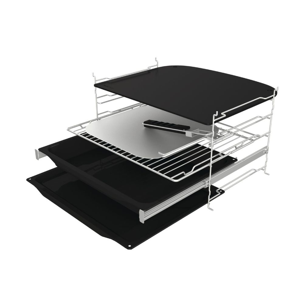 1 βαθύ ταψί, 1 ρηχό ταψί, 1 ειδικό ταψί για pizza, 1 εργονομικό εργαλείο μεταφοράς πίτσας, Πλήρως επεκτεινόμενοι τηλεσκοπικοί οδηγοί πυρόλυσης σε ένα επίπεδο