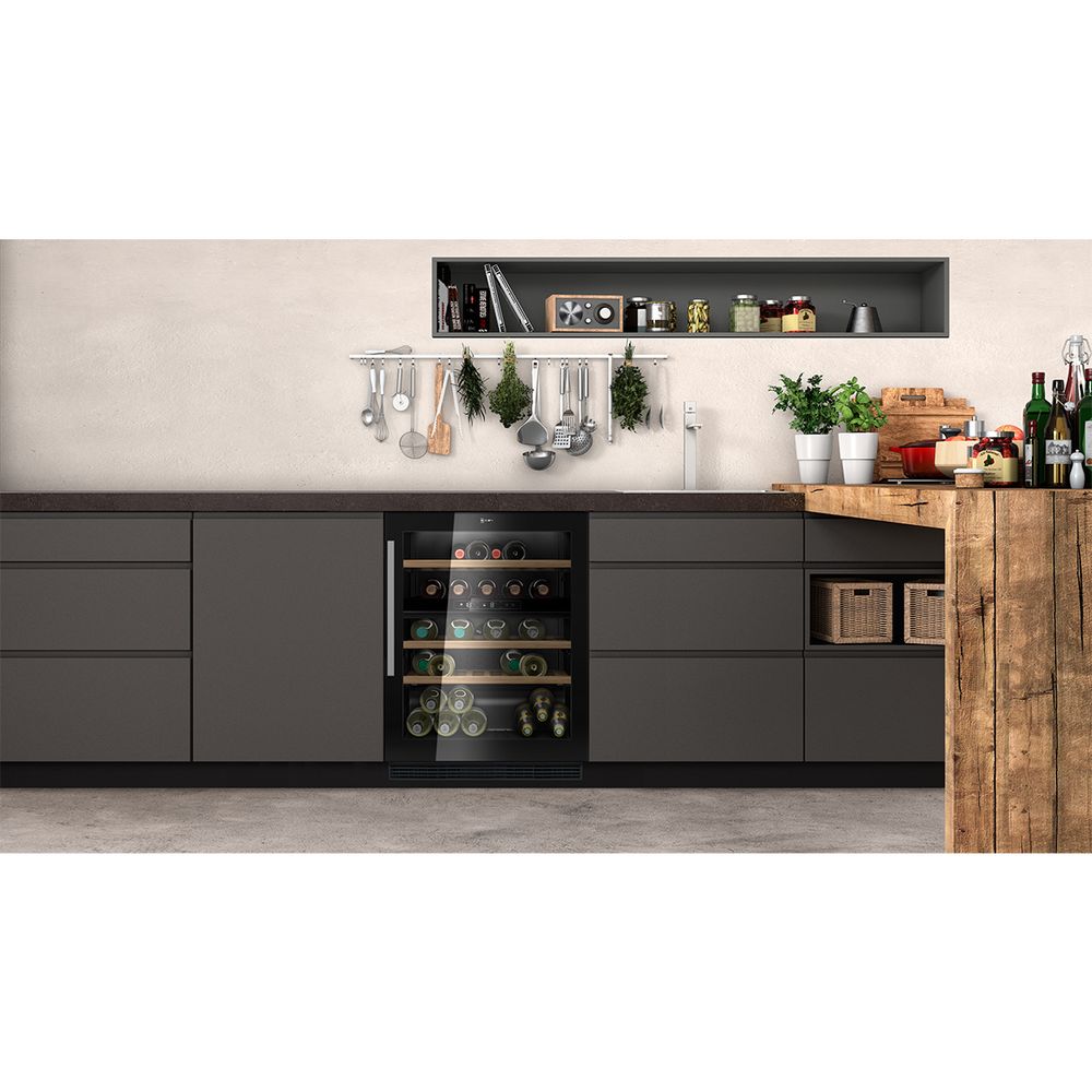 Συντηρητής κρασιών Neff χωρητικότητας 44 μπουκαλιών, με 2 ζώνες θερμοκρασίας ράφια από bamboo και εσωτερικό φωτισμό που αναδεικνύει την συλλογή κρασιών σου.
