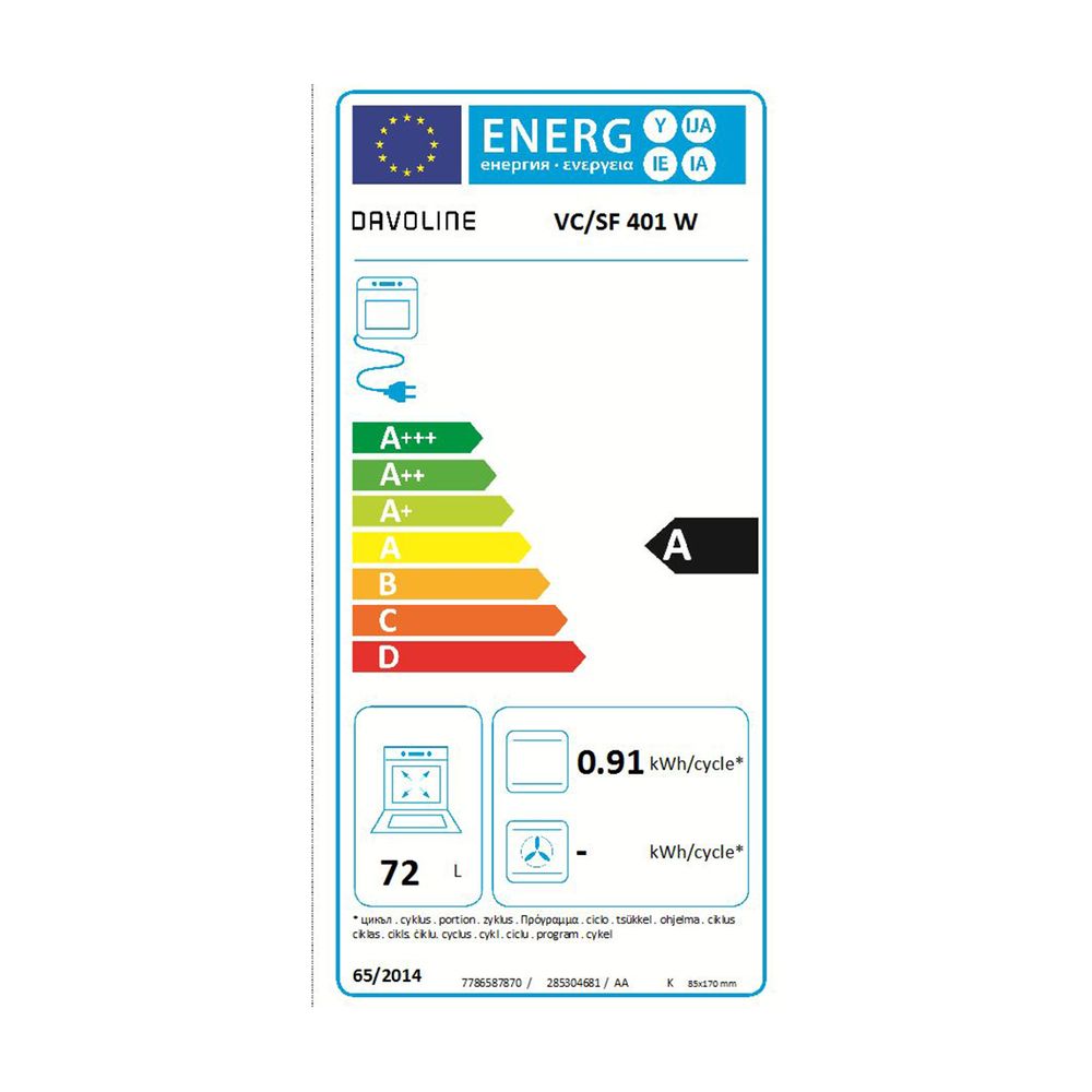 Κουζίνα κεραμική Davoline VC/SF 401 W, 72 lt, ενεργειακής κλάσης Α, με 4 τρόπους ψησίματος, εστίες ταχείας θέρμανσης, διπλό κρύσταλλο στην πόρτα και υψηλής αντοχής εμαγιέ, απολύτως λείο για εύκολο καθάρισμα.