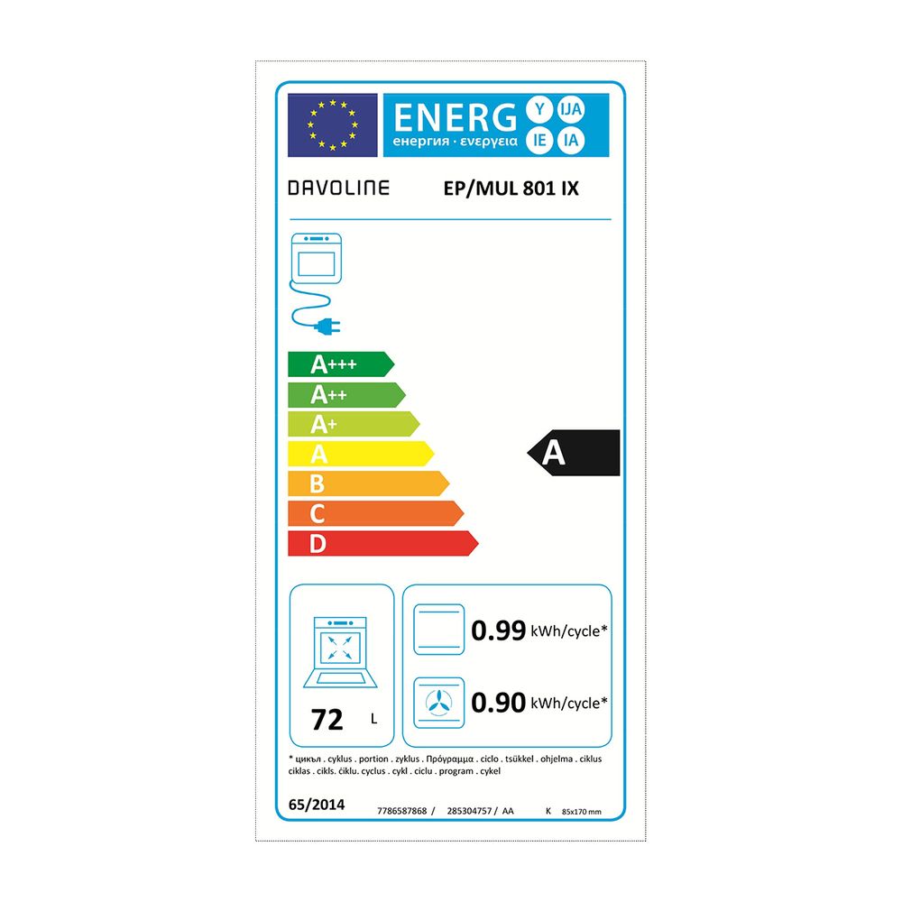 Κουζίνα εμαγιέ Davoline EP/MUL 801 IX, 72 lt, ενεργειακής κλάσης Α, με 8 τρόπους ψησίματος, πλαϊνές ράγες στήριξης ταψιού, εστίες ταχείας θέρμανσης, τριπλό κρύσταλλο στην πόρτα και υψηλής αντοχής εμαγιέ, απολύτως λείο για εύκολο καθάρισμα.