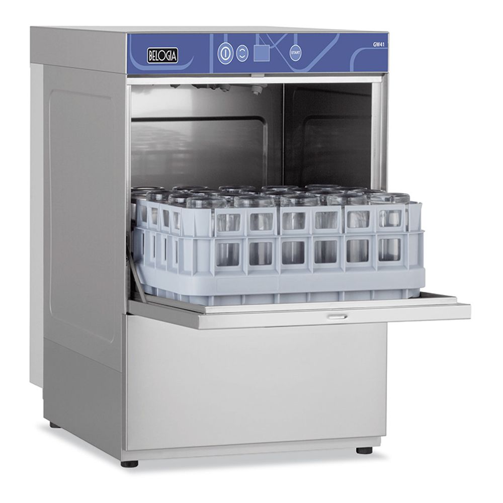 Πλυντήριο ποτηριών ιταλικής κατασκευής με πόρτα διπλών τοιχωμάτων για μείωση του θορύβου και της απώλειας θερμότητας.Επίσης, διαθέτει αντλία αποχεύτευσης για το πλυντήριο πιάτων Βelogia.