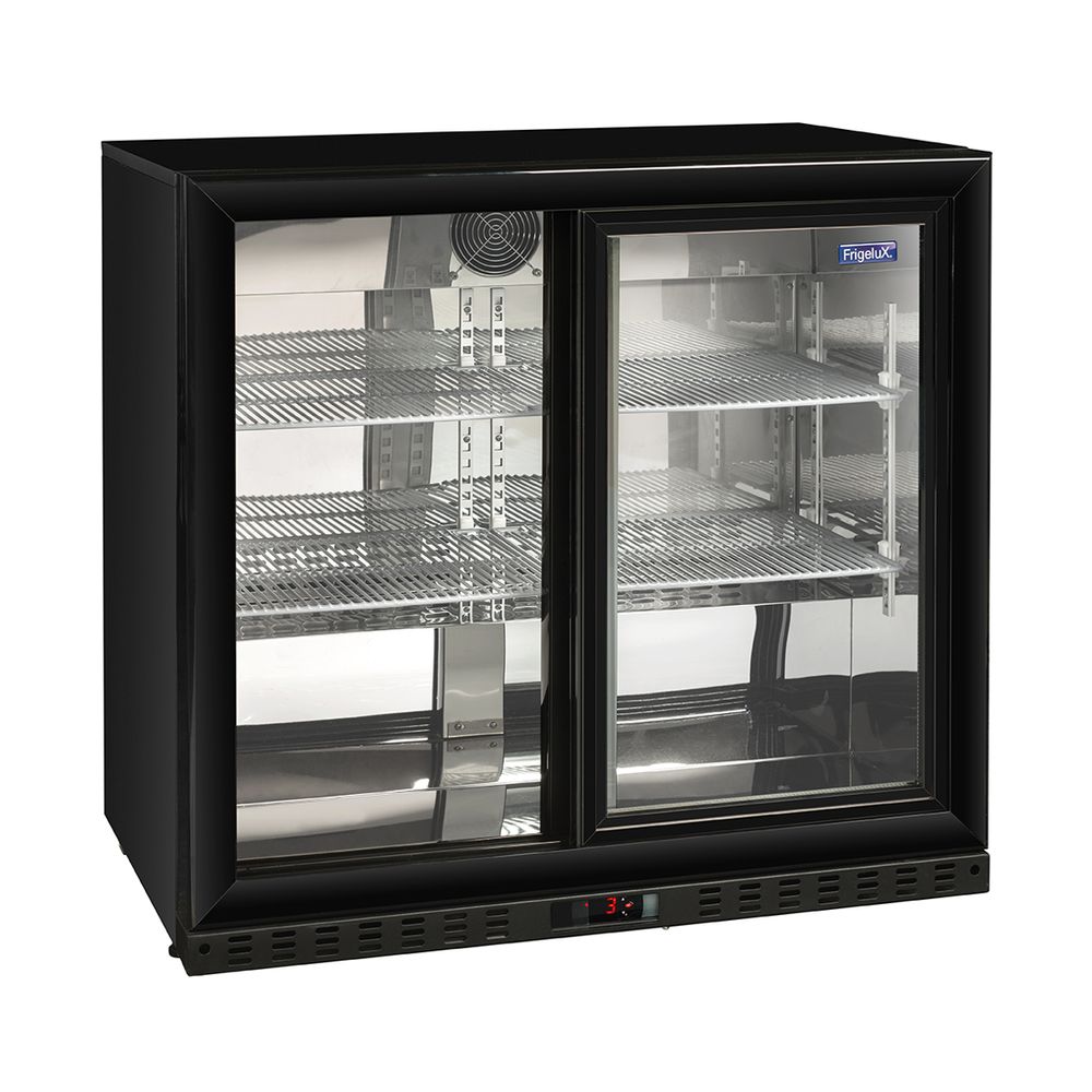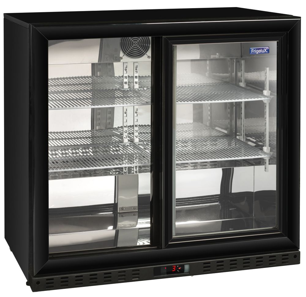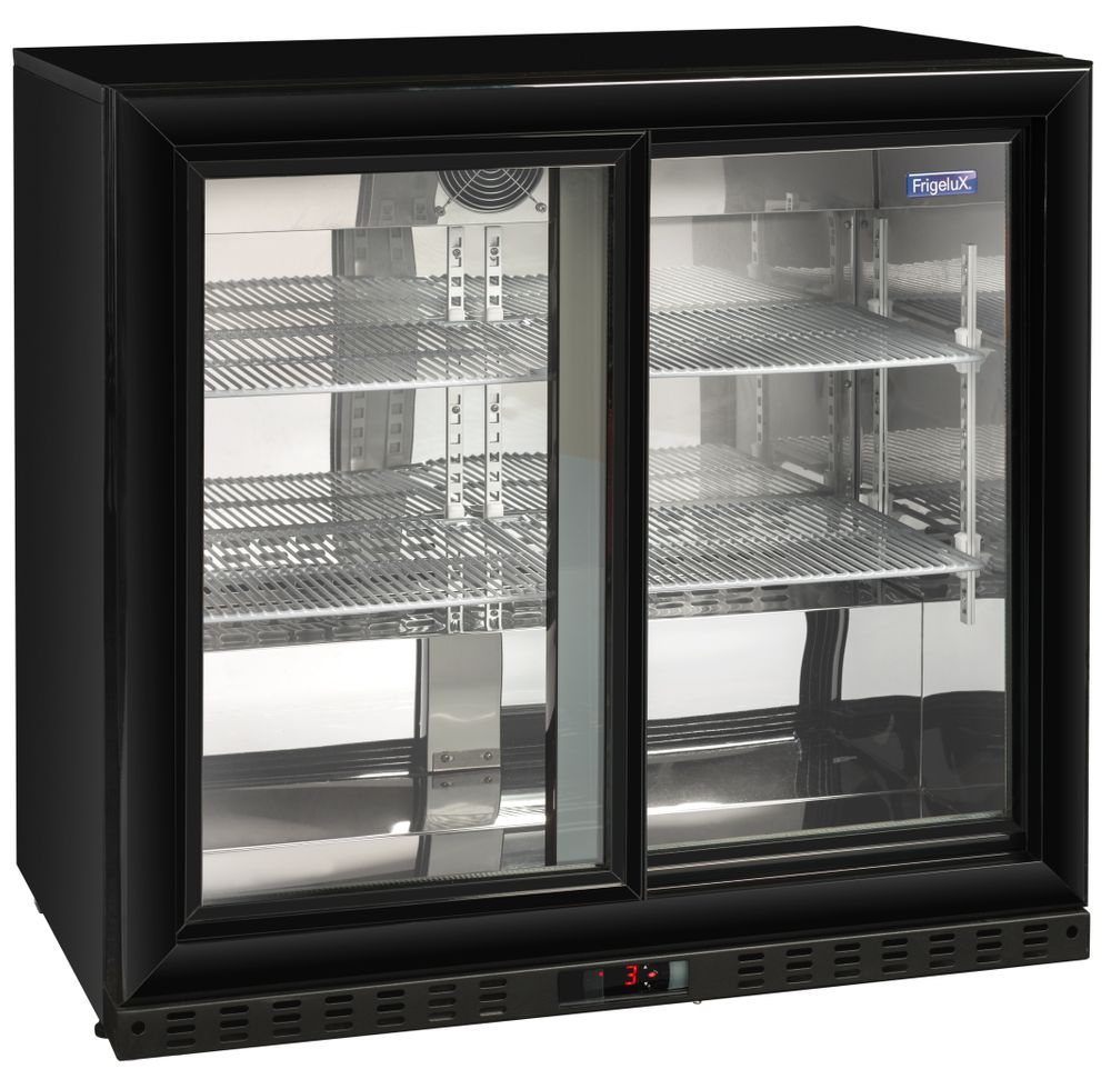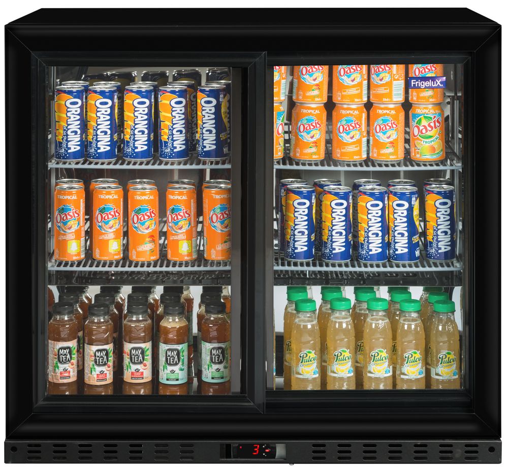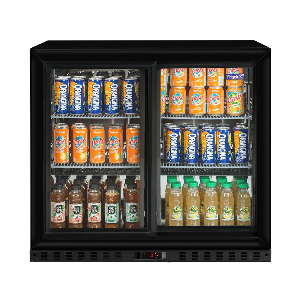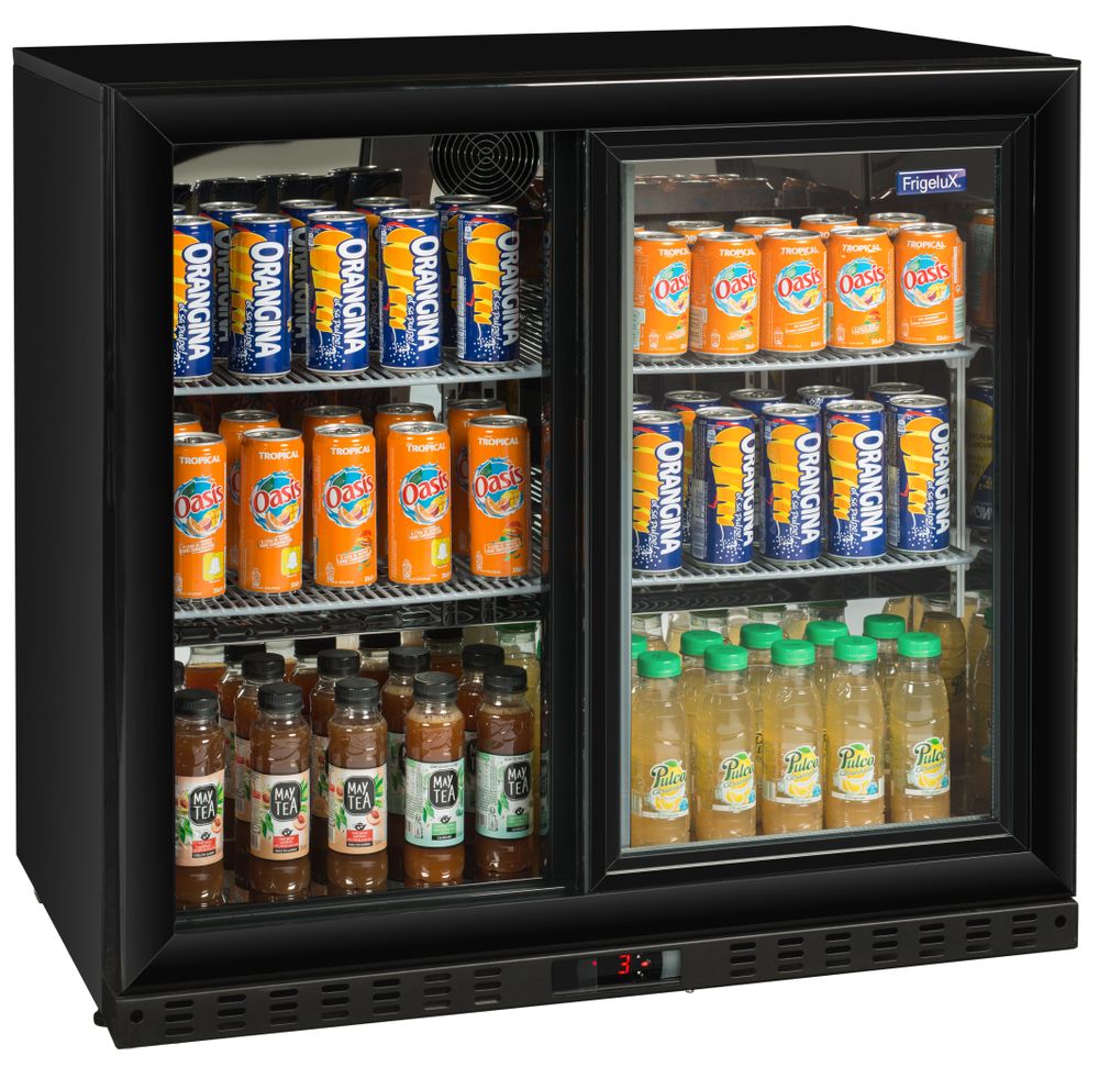 Ψυγείο βιτρίνα Frigelux χωρητικότητας 184 λίτρων. Χωράει 190 κουτιά αναψυκτικών. Χάρη στις γυάλινες συρόμενες πόρτες, μπορείς να επιδείξεις τα προϊόντα σου με ευκολία.
