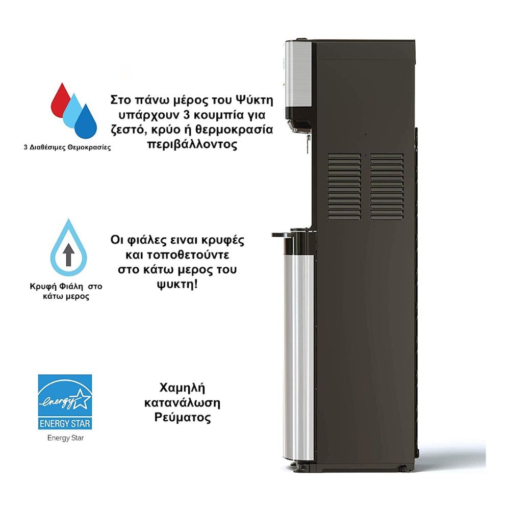 Απόλαυσε κρύο και ζεστό νερό με τον επιδαπέδιο ψύκτη νερού EG202SB. Διαθέτει κάτω φόρτωση για εύκολη τοποθέτηση της φιάλης και παρέχει 4 λίτρα κρύου (10°C) και 10 λίτρα ζεστού νερού (90°C) ανά ώρα. Με την ανοξείδωτη κατασκευή του και τον κομψό σχεδιασμό του, αποτελεί την ιδανική επιλογή για το σπίτι ή το γραφείο σου.