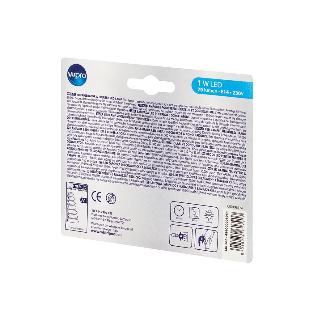 Λάμπα LED 1W της WPRO, ειδικά σχεδιασμένη για ψυγεία και καταψύκτες. Με απόδοση 70 Lumen και υποδοχή E14, προσφέρει αξιόπιστο φωτισμό στις συσκευές σου, λειτουργώντας στα 230V. Ανακάλυψε την τέλεια λύση φωτισμού για το ψυγείο σου.