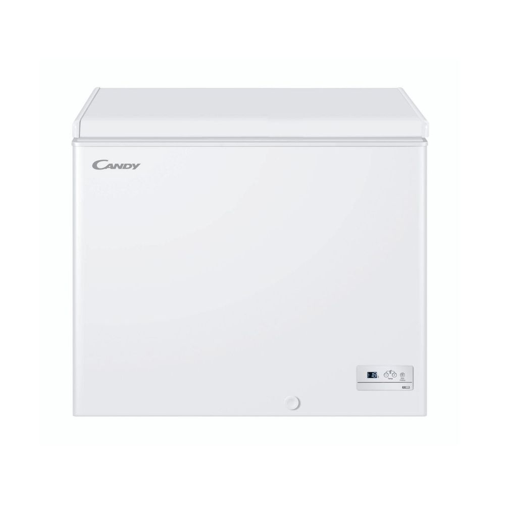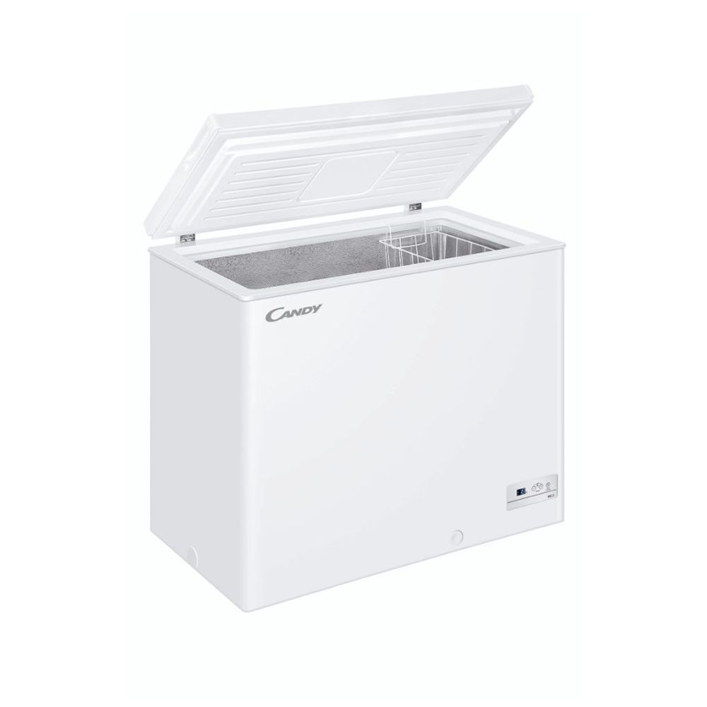 Καταψύκτης μπαούλο CHAE 2002F από τη Candy, με χωρητικότητα 194lt, μηχανικό θερμοστάτη, εύρος θερμοκρασίας από 10°C έως και 43°C, μεταλλικό συρμάτινο καλάθι οργάνωσης και πλαϊνές χειρολαβές στο καπάκι.