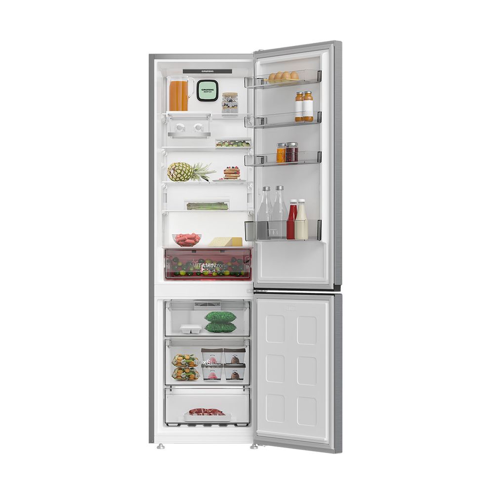Ψυγειοκαταψύκτης Grundig GKPN 46920 XP 60cm με No Frost τύπο ψύξης, συνολικής χωρητικότητας 355lt, με τεχνολογία Duo-Cooling, δυνατότητα αλλαγής φοράς πόρτας, μπουκαλοθήκη στην πόρτα και συρτάρι συντήρησης φρούτων και λαχανικών.