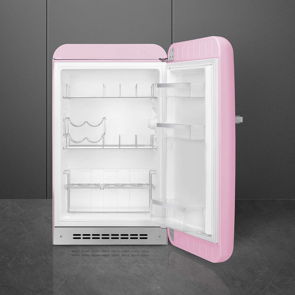 Το ανεξάρτητο ψυγείο Smeg FAB10HRPK5 έχει στρογγυλεμένη σχεδίαση και αισθητική Style της δεκαετίας του '50. Είναι εξοπλισμένο με στατική ψύξη, εσωτερικό φωτισμό LED, 2 ρυθμιζόμενα γυάλινα ράφια, συνολικό καθαρό όγκο 135 λίτρων και ενεργειακή κλάση E.