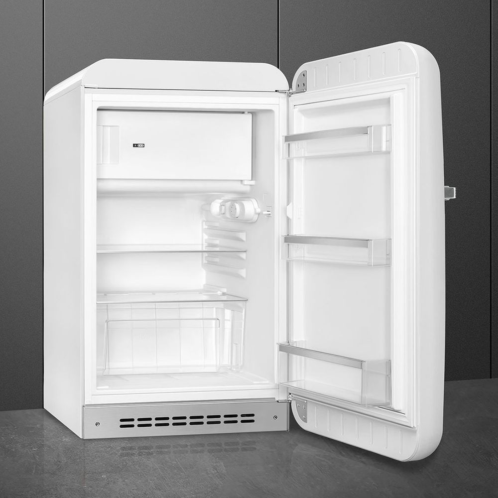 Το ανεξάρτητο ψυγείο Smeg FAB10RWH5 χωρητικότητας 122 lt έχει στρογγυλεμένη σχεδίαση και αισθητική Style της δεκαετίας του '50. Είναι εξοπλισμένο με στατική ψύξη, εσωτερικό φωτισμό LED, 1 ρυθμιζόμενο γυάλινο ράφι, 1 συρτάρι φρούτων και λαχανικών, θάλαμο κατάψυξης και ενεργειακή κλάση E.