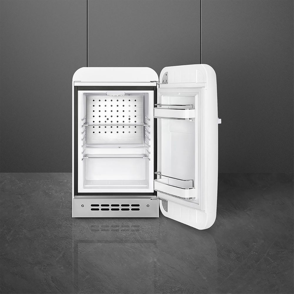 Το ανεξάρτητο ψυγείο Smeg FAB5RWH5 χωρητικότητας 34 lt έχει στρογγυλεμένη σχεδίαση και αισθητική Style της δεκαετίας του '50. Είναι εξοπλισμένο με στατική ψύξη, εσωτερικό φωτισμό LED, δύο χρωμιωμένα ράφια και ενεργειακή κλάση D. Ένα μικρό μίνι μπαρ, διαθέσιμο σε διάφορα χρώματα.