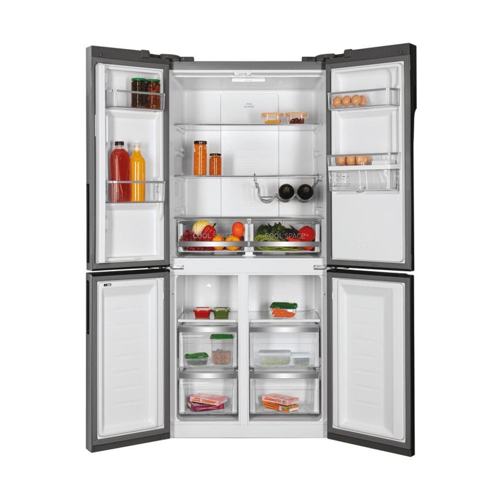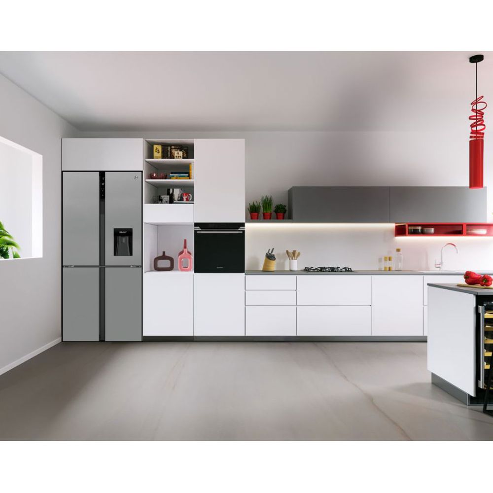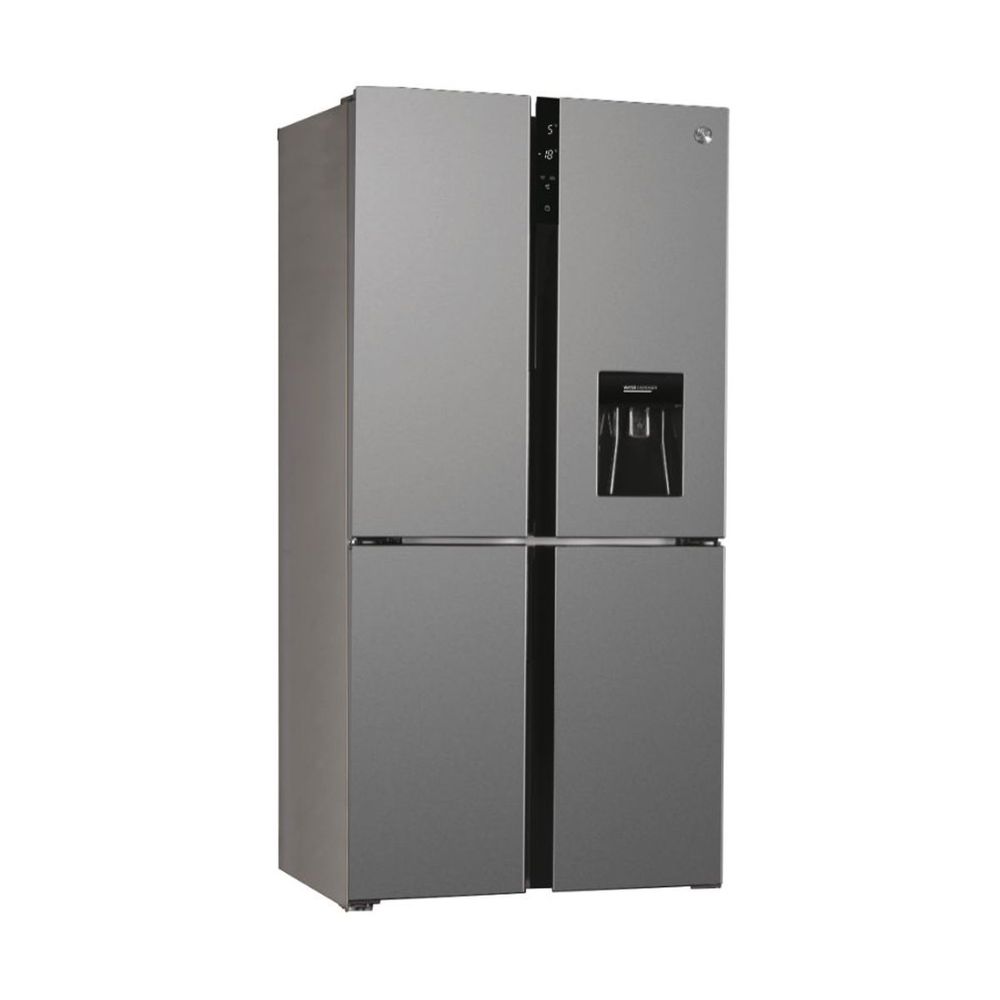 Ψυγείο ντουλάπα Hoover HSC818EXWD μικτής χωρητικότητας 427lt, με Full No Frost τύπο ψύξης, ασημί χρώμα, οθόνη ενδείξεων και μπουκαλοθήκη στην πόρτα και στο ράφι.