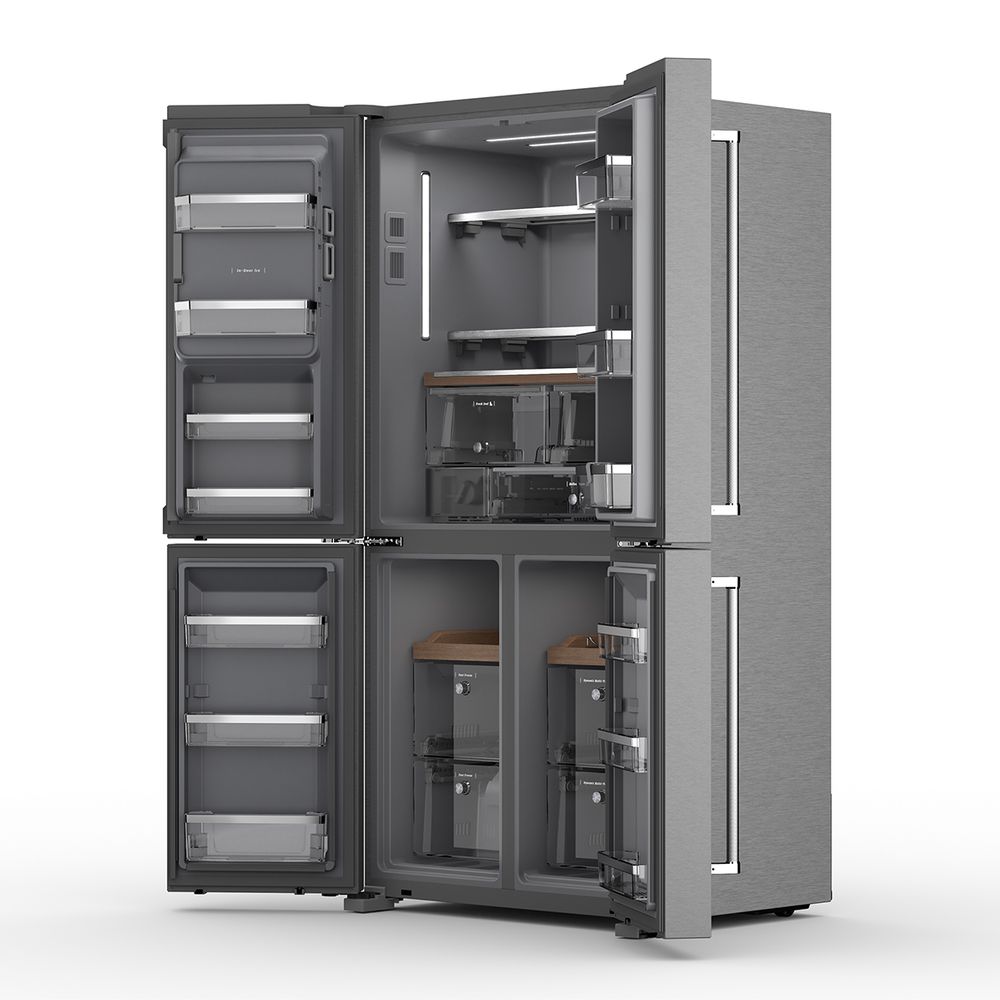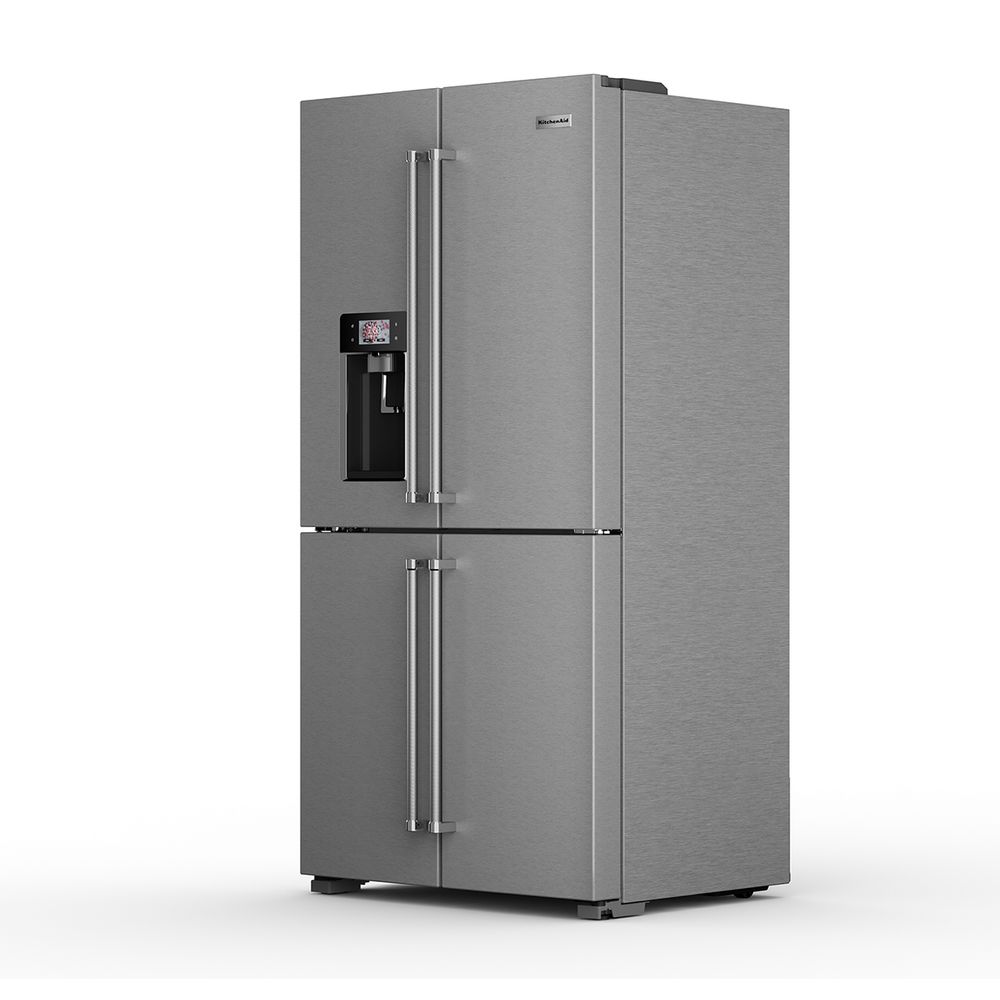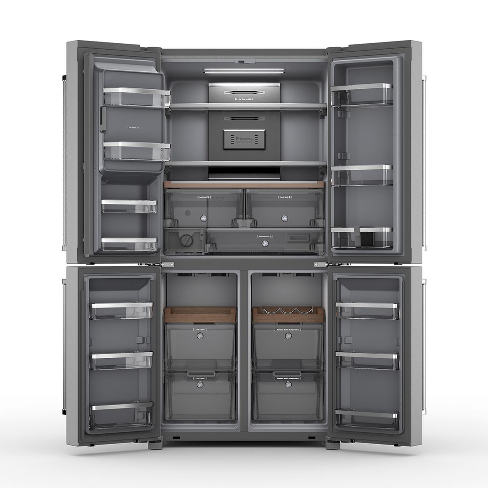 Τετράθυρος ψυγειοκαταψύκτης Kichenaid KCQXX 18900 με συνολική μικτή χωρητικότητα 655 lt, τεχνολογία Total No Frost για τέλεια διατήρηση των τροφίμων με αυτόματη απόψυξη, έγχρωμη LED Οθόνη αφής και σύστημα φροντίδας τροφίμων Preserva που βοηθάει τόσο τα φρέσκα όσο και τα κατεψυγμένα τρόφιμα να διατηρήσουν τη γεύση και την υφή τους.