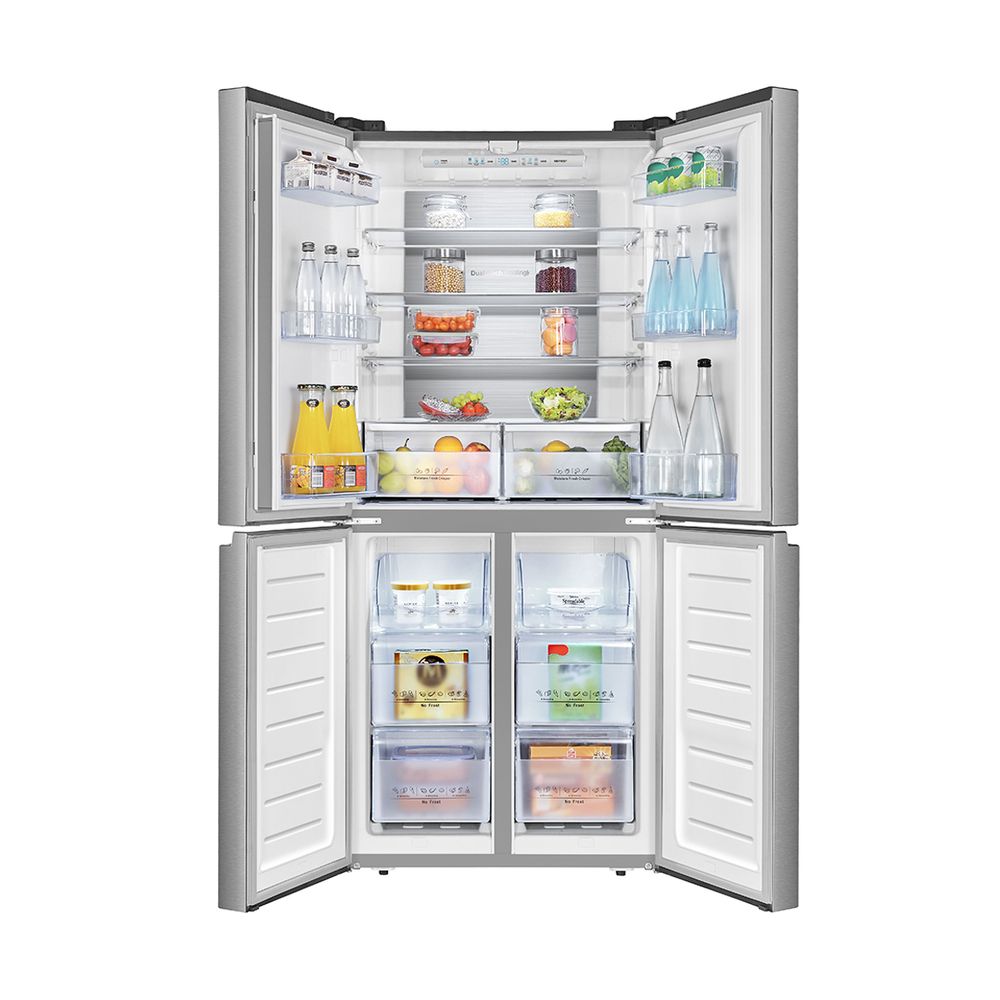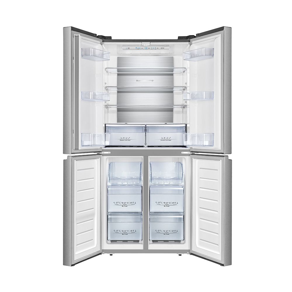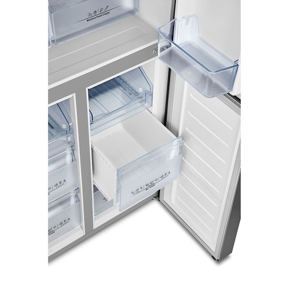 Ψυγείο ντουλάπα Hisense RQ563N4SI2 μικτής χωρητικότητας 454lt, με τύπο ψύξης Full No Frost, πολλαπλή ροή αέρα, Inox χρώμα, οθόνη ενδείξεων και μπουκαλοθήκη στην πόρτα.
