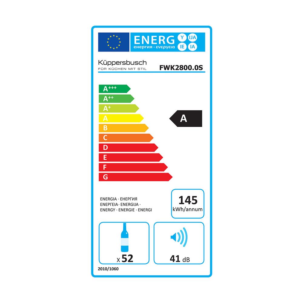 Συντηρητής κρασιών Kuppersbusch FWK2800.0S με δυνατότητα χωρητικότητας έως 52 φιάλες, 2 ζώνες θερμοκρασίας, ηλεκτρονικός έλεγχος θερμοκρασίας με κουμπιά, ηλεκτρονική ένδειξη θερμοκρασίας, σύστημα ψύξης δυναμικής κυκλοφορίας αέρα, 8 ξύλινα συρόμενα αφαιρούμενα ράφια, 1 ξύλινο ράφι 45° για παρουσίαση και μαύρη γυάλινη πόρτα με προστασία UV. «*Το χερούλι πωλείται ξεχωριστά και δεν εμπεριέχεται στην συσκευασία».