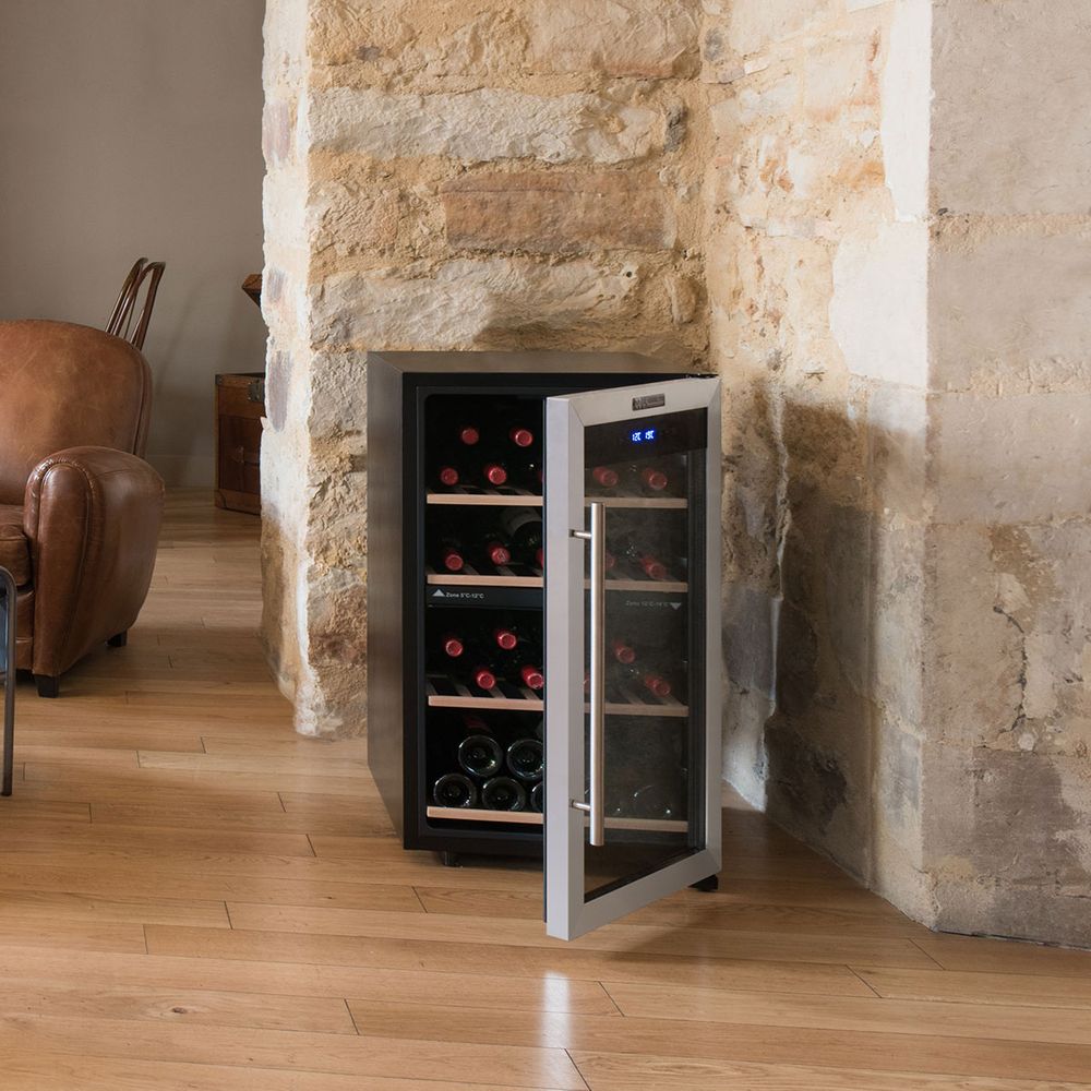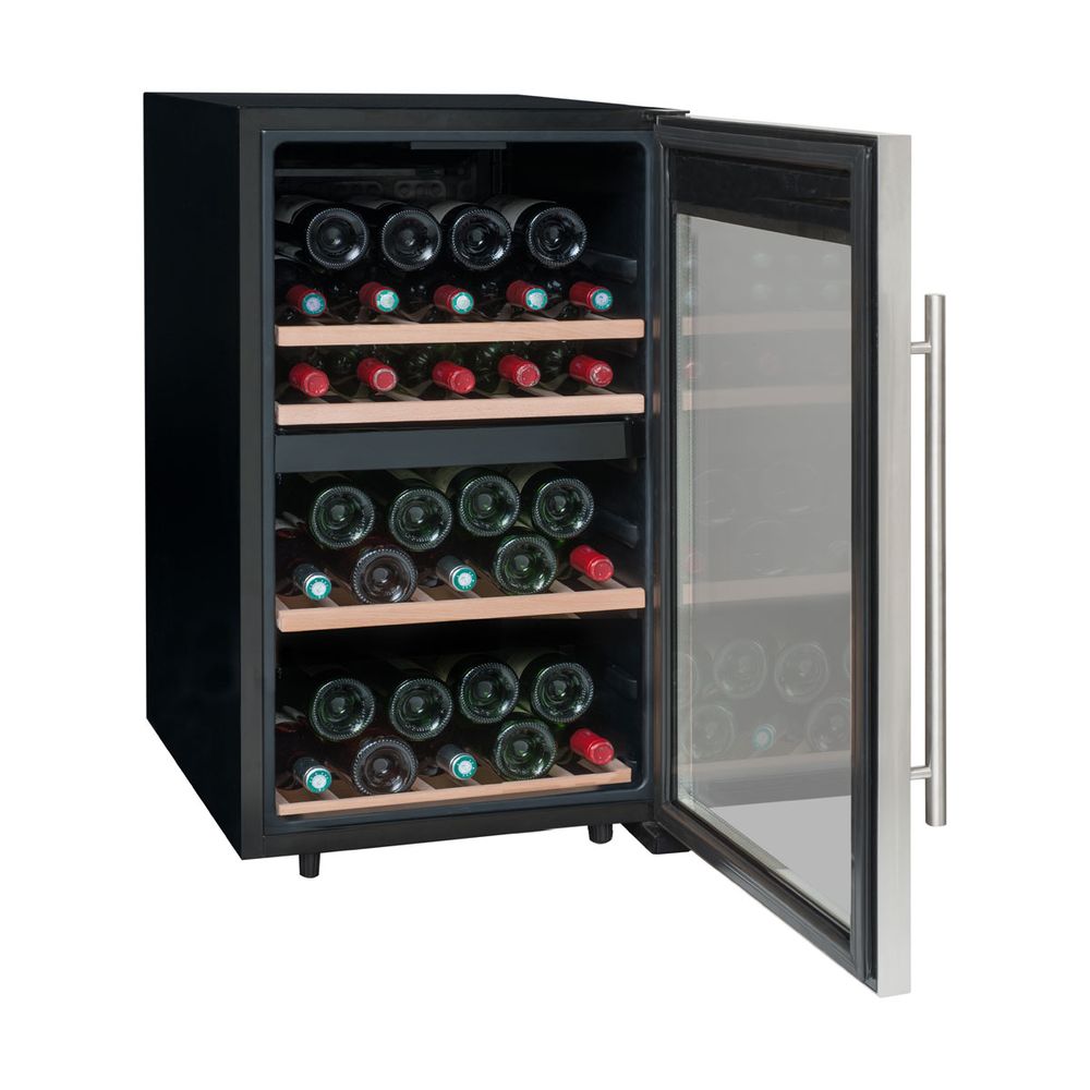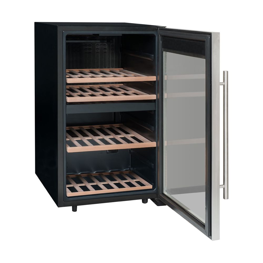 Κάβα κρασιού LS51.2Z για έως και 50 μπουκάλια. Σε αυτήν την κάβα διπλής ζώνης, κάθε διαμέρισμα μπορεί να ρυθμιστεί ανεξάρτητα από το άλλο. Παρέχεται με 3 σταθερά ράφια και 1 μισό ράφι από ξύλο οξιάς.