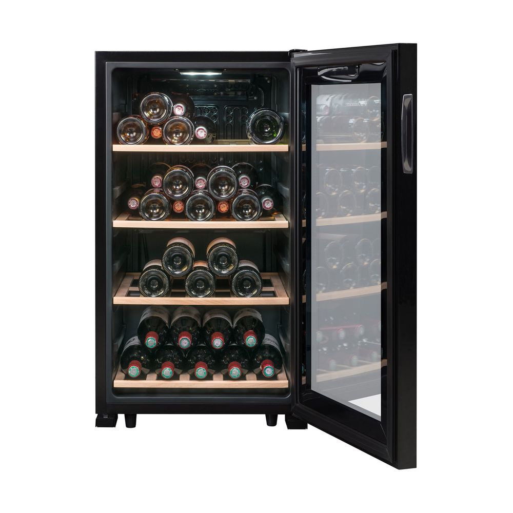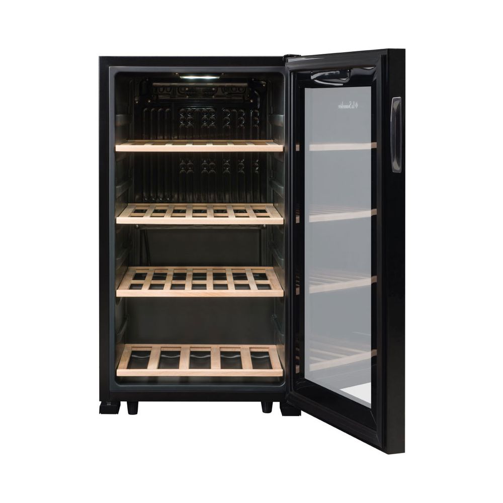Κάβα κρασιού LS52 Black μονής ζώνης που εξυπηρετεί για προετοιμασία 52 φιαλών κρασιού. Αυτή η κομψή κάβα με την αντι-UV γυάλινη πόρτα διαθέτει 3 σταθερά ράφια και 1 μισό ράφι από ξύλο οξιάς.