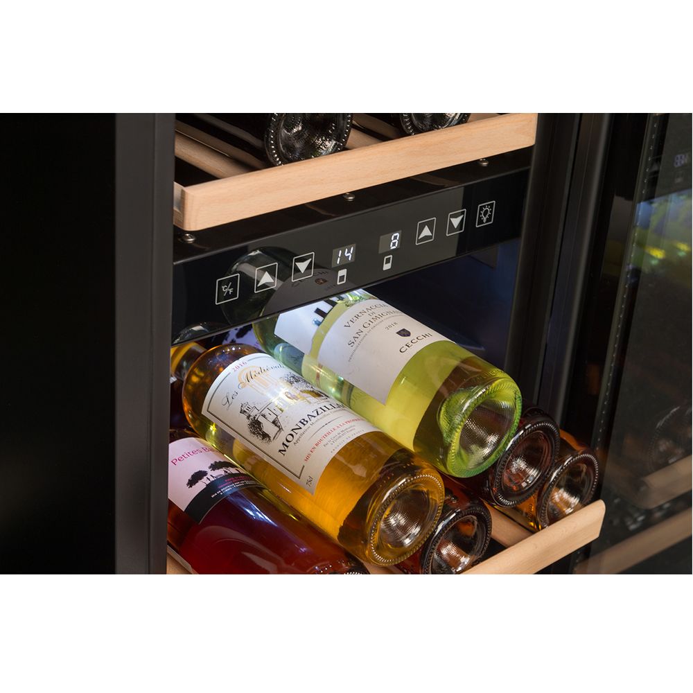 Συντηρητής κρασιού διπλής ζώνης SLS34DZ για έλεγχο θερμοκρασίας 33 φιαλών κρασιού. Κάθε ζώνη μπορεί να ρυθμιστεί ανεξάρτητα από την άλλη. Παραδίδεται με 4 σταθερά ράφια από ξύλο οξιάς και ξύλινο στήριγμα στο κάτω μέρος της κάβας. Μοντέρνο και συμπαγές, το SLS34DZ είναι ένα από τα best-seller της La Sommelière.