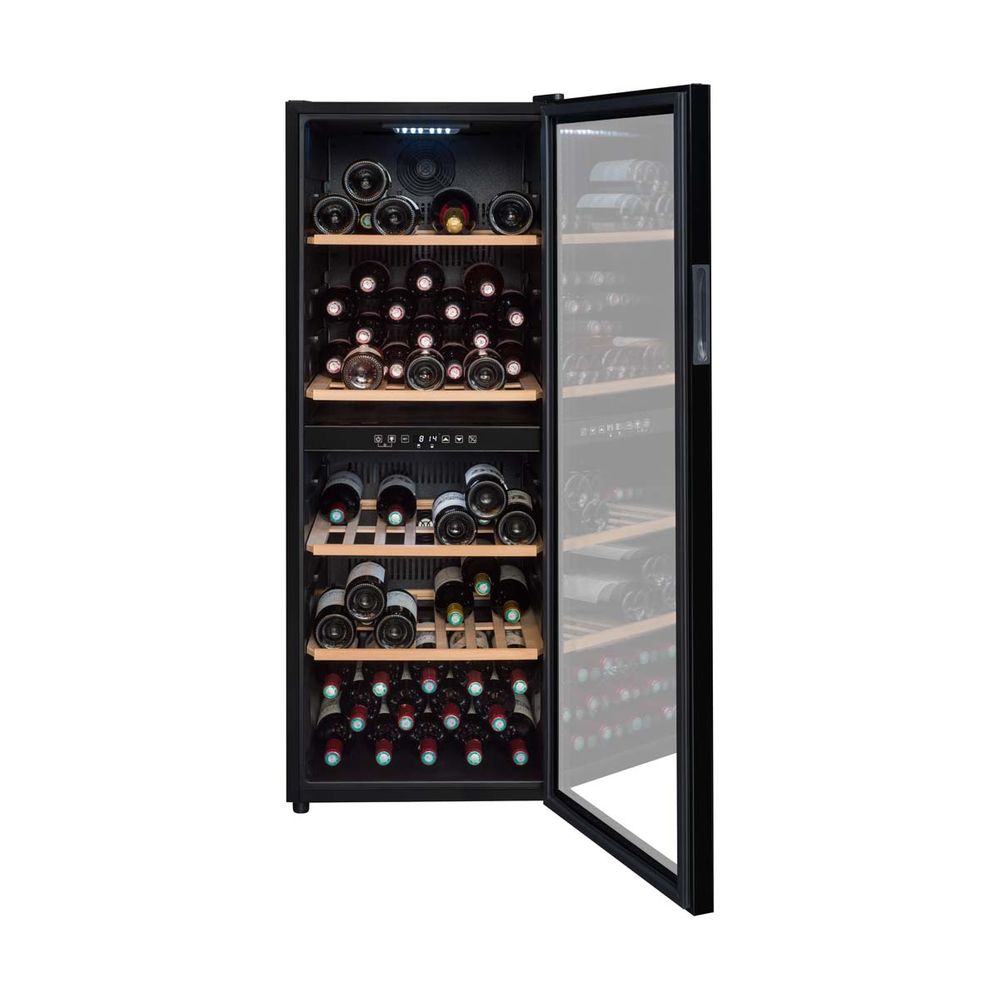 Διζωνική κάβα κρασιών για συντήρηση 91 φιαλών κρασιού. Κάθε ζώνη προσαρμόζεται ανεξάρτητα από την άλλη. Παρέχεται με 4 ημι-συρόμενα ξύλινα ράφια (οξιάς).