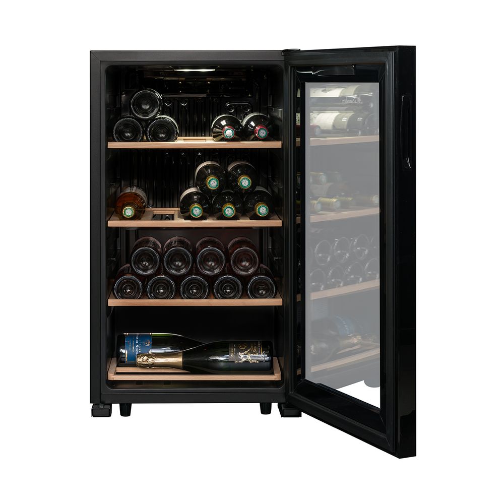 Συντηρητής κρασιού για αποθήκευση 36 φιαλών κρασιού. Ολόμαυρος, το συντηρητής είναι αισθητικά ευχάριστος με τη μεγάλη πόρτα με τζάμια και το διαφανές σκληρυμένο τζάμι με τριπλό γυαλί επεξεργασμένο κατά της υπεριώδους ακτινοβολίας. Έχει ακριβή και ομοιογενή θερμοκρασία χάρη στο εξελιγμένο σύστημα ψύξης.