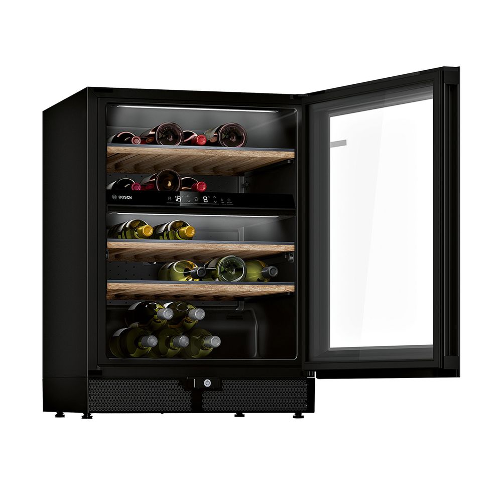 Συντηρητής κρασιών Bosch KWK16ABGB με χωρητικότητα 44 φιαλών, 5 ράφια, φωτισμό παρουσίασης, διπλή ζώνη θερμοκρασίας, door lock και δυνατότητα αλλαγής φοράς της πόρτας.