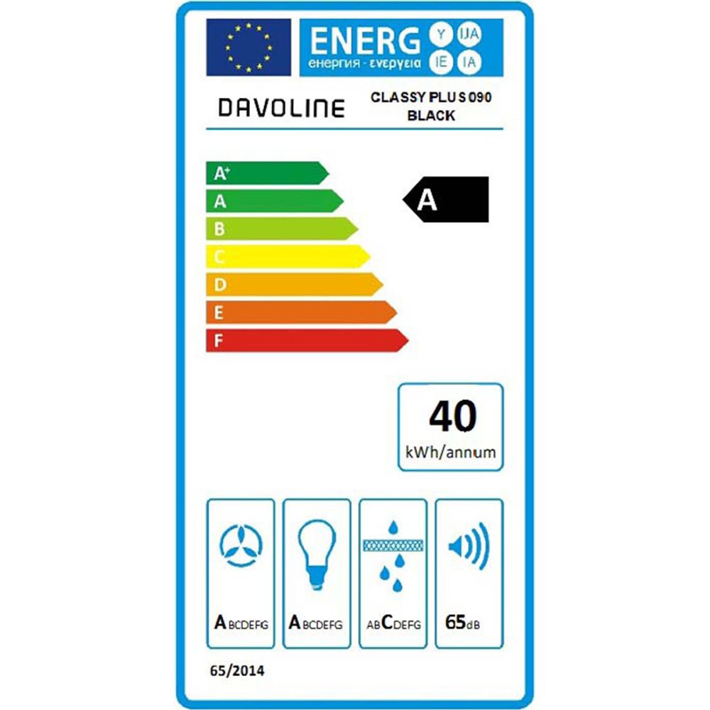 Απορροφητήρας καμινάδα Davoline Classy Plus 090 BL με υψηλή ενεργειακή κλάση Α, μέγιστη απορροφητικότητα 621 m3/h, επίπεδο θορύβου 48-65 db και πίνακα ελέγχου με ψηφιακή οθόνη αφής για γρήγορη επιλογή των επιθυμητών ρυθμίσεων και του φωτισμού.