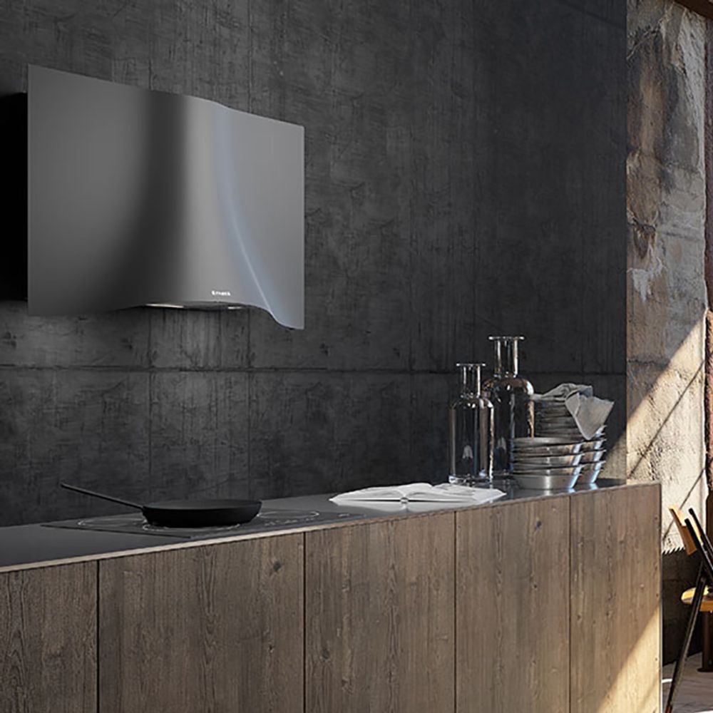 Απορροφητήρας καμινάδα Faber Collection Veil BK A90 με εξαιρετικά υψηλή απορροφητική ισχύ 700 m3/h κα έχει ελαφρύ σχήμα με μοναδικές καμπύλες και διαθέτει ένα ορθογώνιο πλαίσιο που αποσπάται από τον τοίχο.