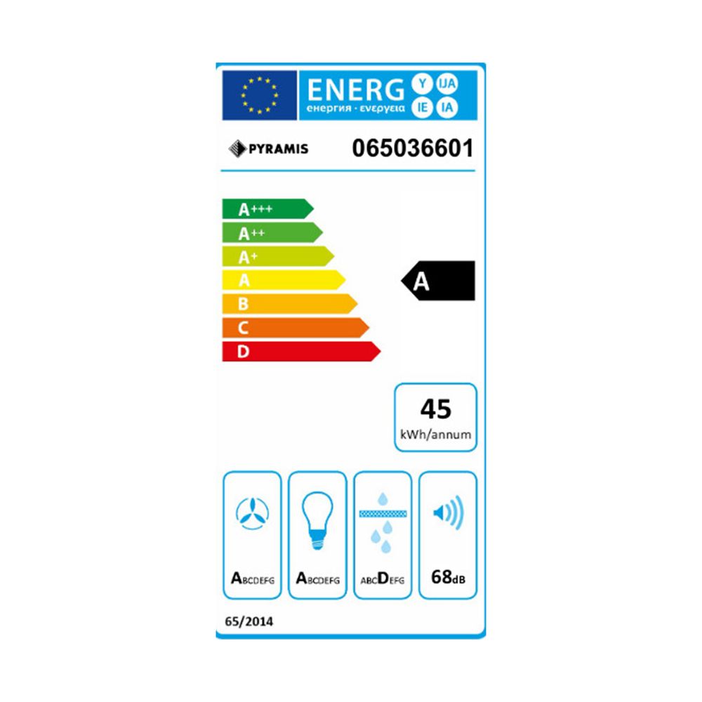 Απορροφητήρας καμινάδα της Pyramis με μέγιστη απορροφητική ισχύς 650m³/h , μεταλλικά φίλτρα, πιεζόμενα πλήκτρα και χαμηλό θόρυβο.