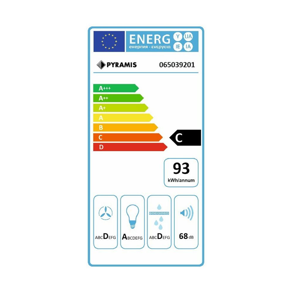 Απορροφητήρας καμινάδα της Pyramis με μέγιστη απορροφητική ισχύς 700m³/h , μεταλλικά φίλτρα, πλήκτρα αφής και χαμηλό θόρυβο.