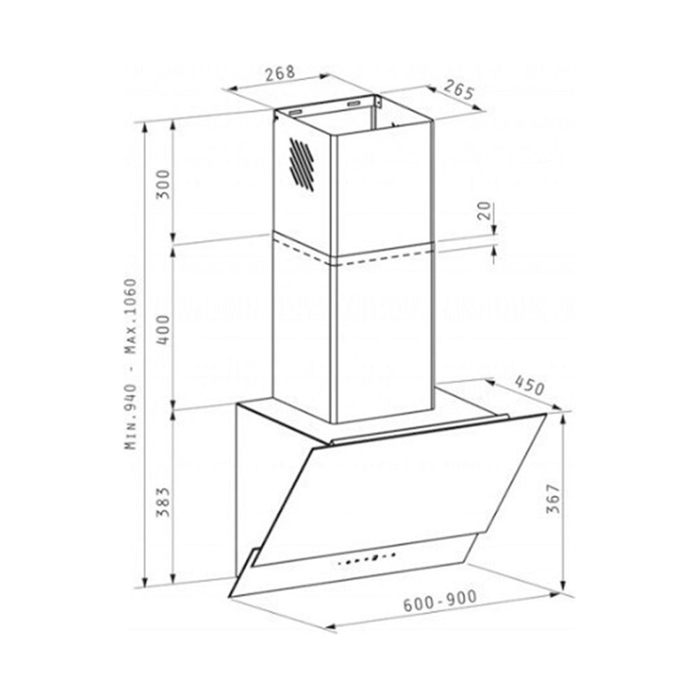 Απορροφητήρας καμινάδα της Pyramis με μέγιστη απορροφητική ισχύς 455m³/h , μεταλλικά φίλτρα, πλήκτρα αφής και χαμηλό θόρυβο.